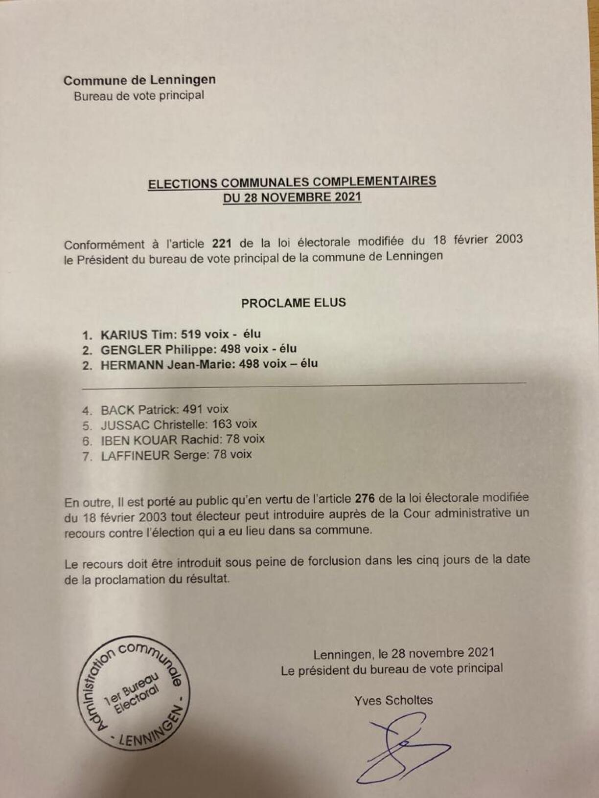 De Verdikt vun den 1.149 ageschriwwene Wieler ass kloer: déi 3 Conseilleren déi zréckgetruede sinn, gi vu Kandidate vun der Oppositioun ersat.