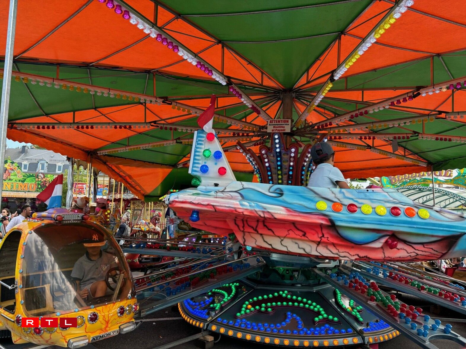 Vum Riserad goung et eriwwer op déi kleng Fliger. Eng Traditioun, déi fir d’Kanner ëmmer e Must ass. Zwee Mol 3 Euro. Iert et eng éischt Erfrëschung fir d’Kanner gouf. Zwou Bulle Glace (5 Euro) an en Eisekuch mat Schlagsan och fir 5 Euro. Duerno gouf gefëscht. 12 Inte fir 6 Euro. Hei bäisse se op d’mannst nach un. An e Bibelot als Belounung hu se sécher an der Täsch.