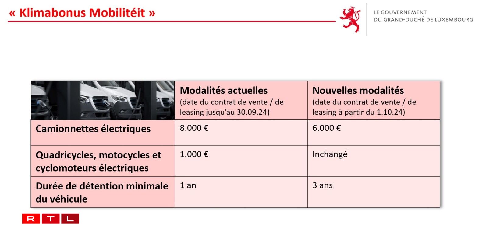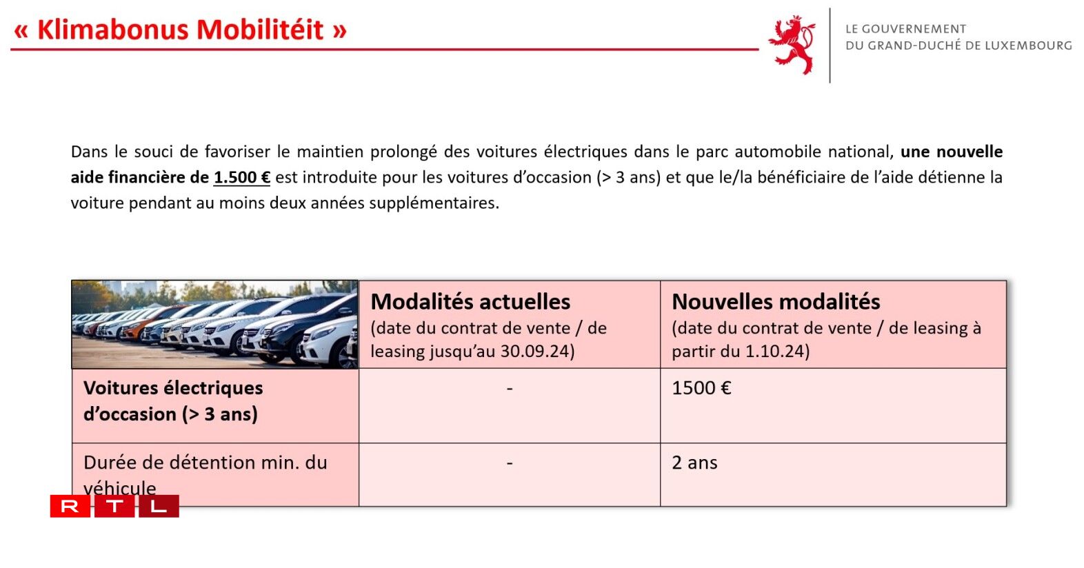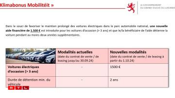 “Et ass een Auto, dee muss hei zu Lëtzebuerg ugemellt sinn. E muss och fir d’éischt schonn emol 3 Joer um Marché gewiescht sinn, fir kënne verkaaft ze ginn. Da muss een en duerno och 2 Joer halen, fir kënnen d’Primme vun 1.500 Euro ze kréien. Wann een den Auto net 2 Joer laang hält, da misst een d’Primme zeréck bezuelen.”