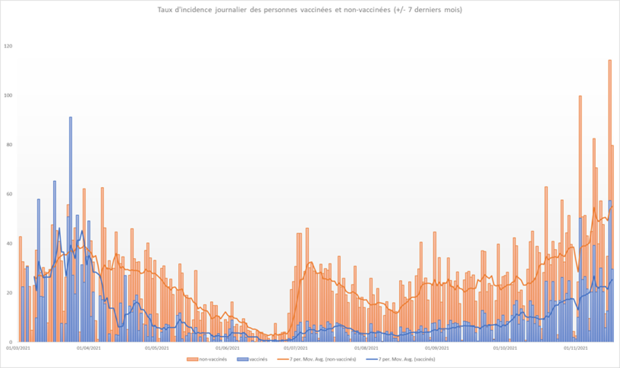 Pour la semaine du 15 au 21 novembre, le nombre de personnes testées positives à la COVID-19 a augmenté de 1.447 à 1.897 (+31%).Parmi les 1.897 nouvelles infections, le taux d'incidence des nouvelles personnes testées positives non-vaccinées est de 450,92 pour 100.000 habitants et de 217,71 pour 100.000 habitants pour celles qui avaient un schéma vaccinal complet.