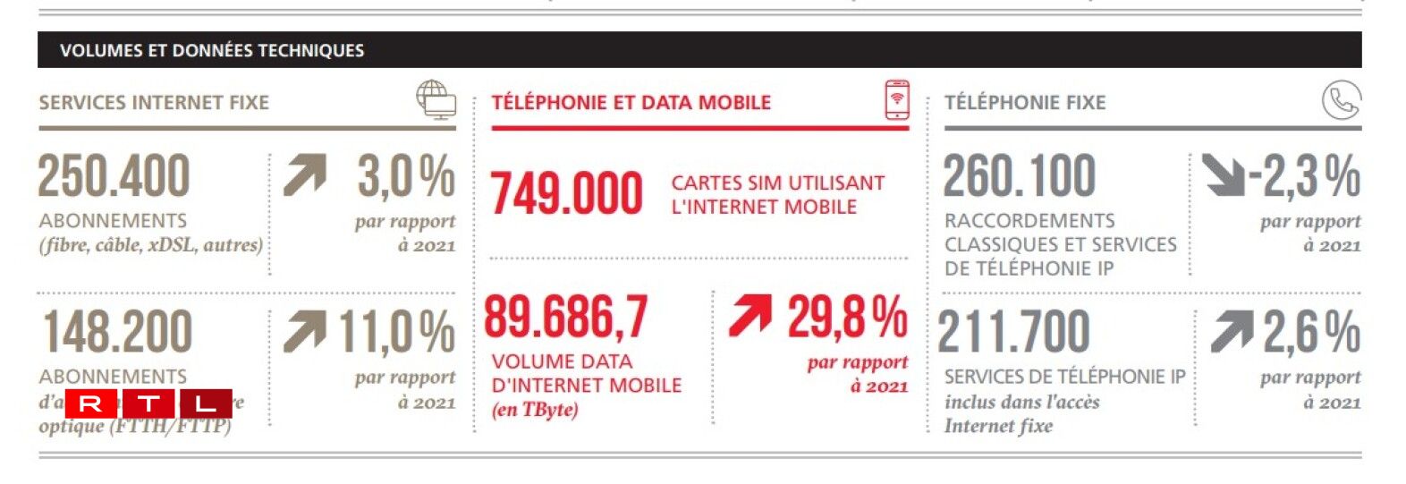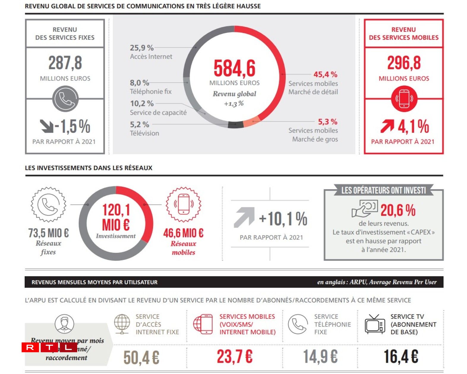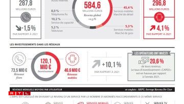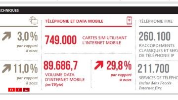 D’Investitiounen an d ‘Telekommunikatiounsreseaue ware weider héich. Bei de fixe Leitunge war dat an der Haaptsaach fir den Ausbau vum Glasfaser. Beim Mobille fir d’Ëmstellung op de 5G. D’Investitiounen an de mobille Reseau sinn ëm méi wéi ee Véierel an d’Luucht gaangen a louche bei knapp 47 Milliounen Euro. Den Telekommunikatiounssecteur hat zejoert e Revenu vu knapp 585 Milliounen Euro.