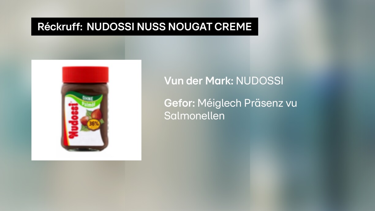 Et geet ëm “Nudossi Nuss Nougat Creme”, déi méiglecherweis Salmonellen enthale kéint. De Produit gouf op verschiddene Plazen uechter Lëtzebuerg verkaf, dat tëscht dem 19. August zejoert an dem 13. Abrëll. LU-Alert huet am Kontext och en Niveau de vigilance jaune erausginn an zu Virsiicht opgeruff. Weider Detailer fannt Dir um Site vun LU-Alert.