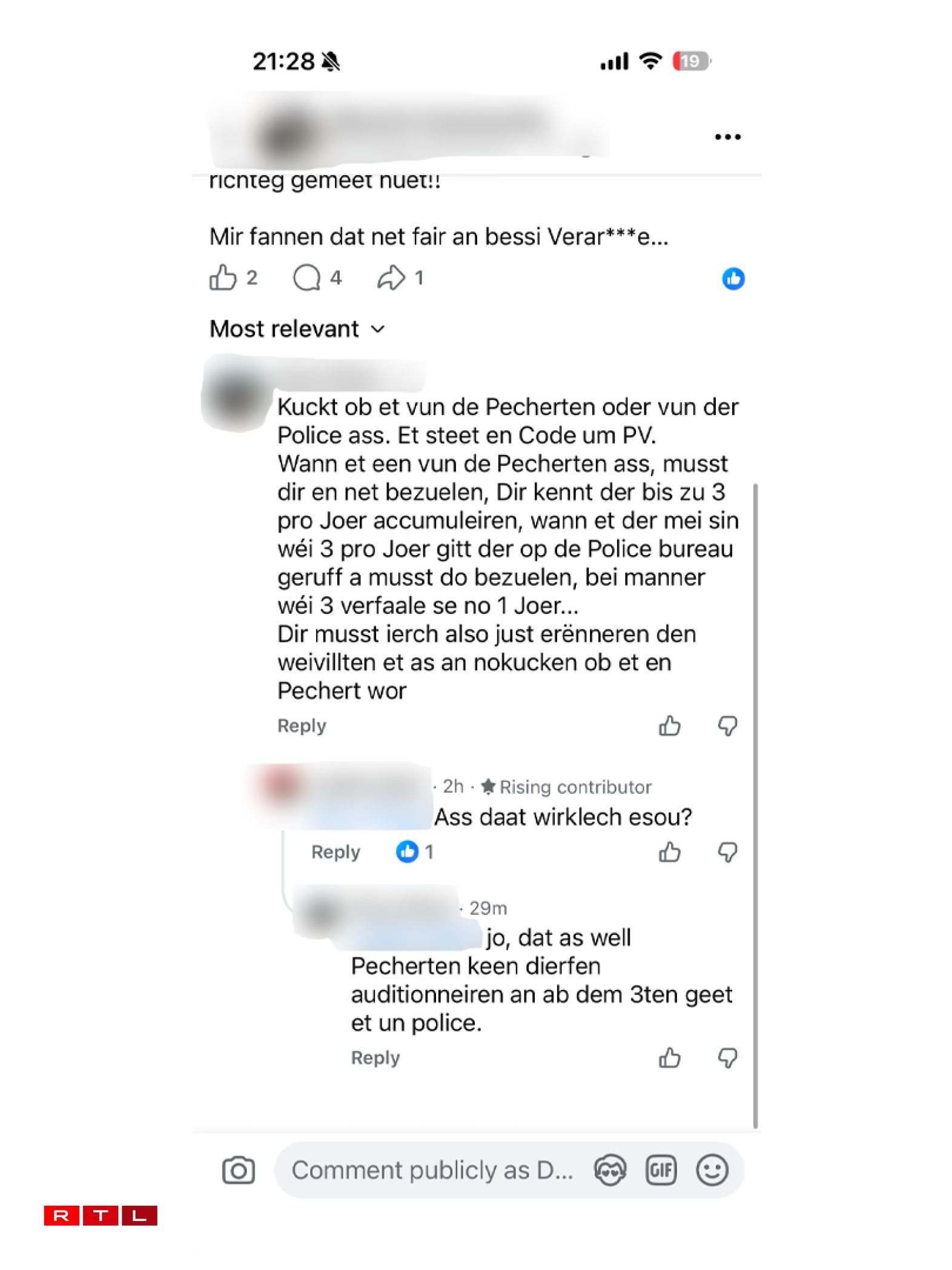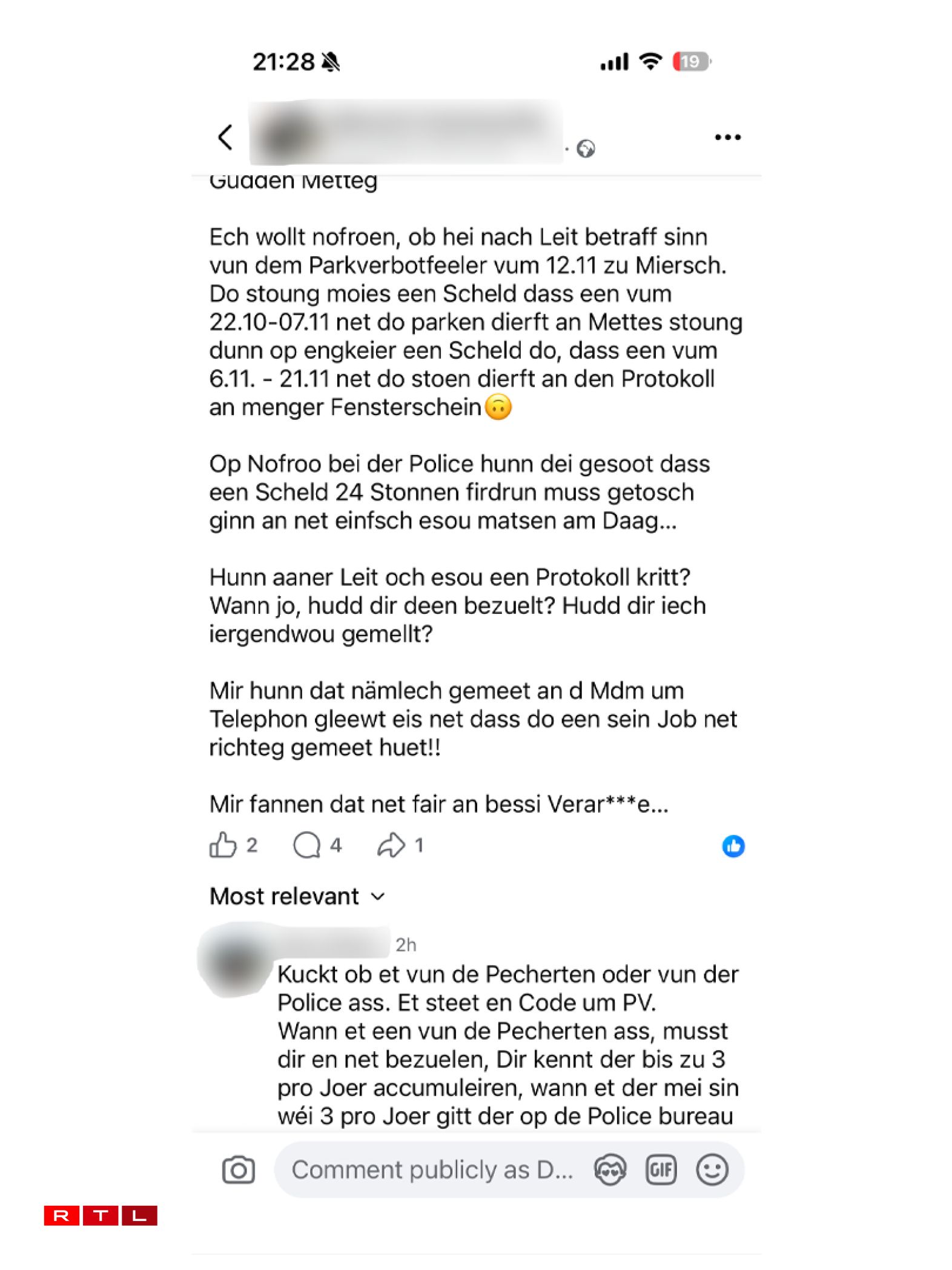 Ënnert dem Post kritt d’Persoun eng Äntwert vum Abby Toussaint, Schäffen an der Mierscher Gemeng. D’Schëlder op der concernéierter Plaz hätten ëmgedréint an op der Säit gestanen. Op Nofro hi beim Steve Hatto, Chef vum Service “Proximité”, hu mir follgend Erklärung kritt: