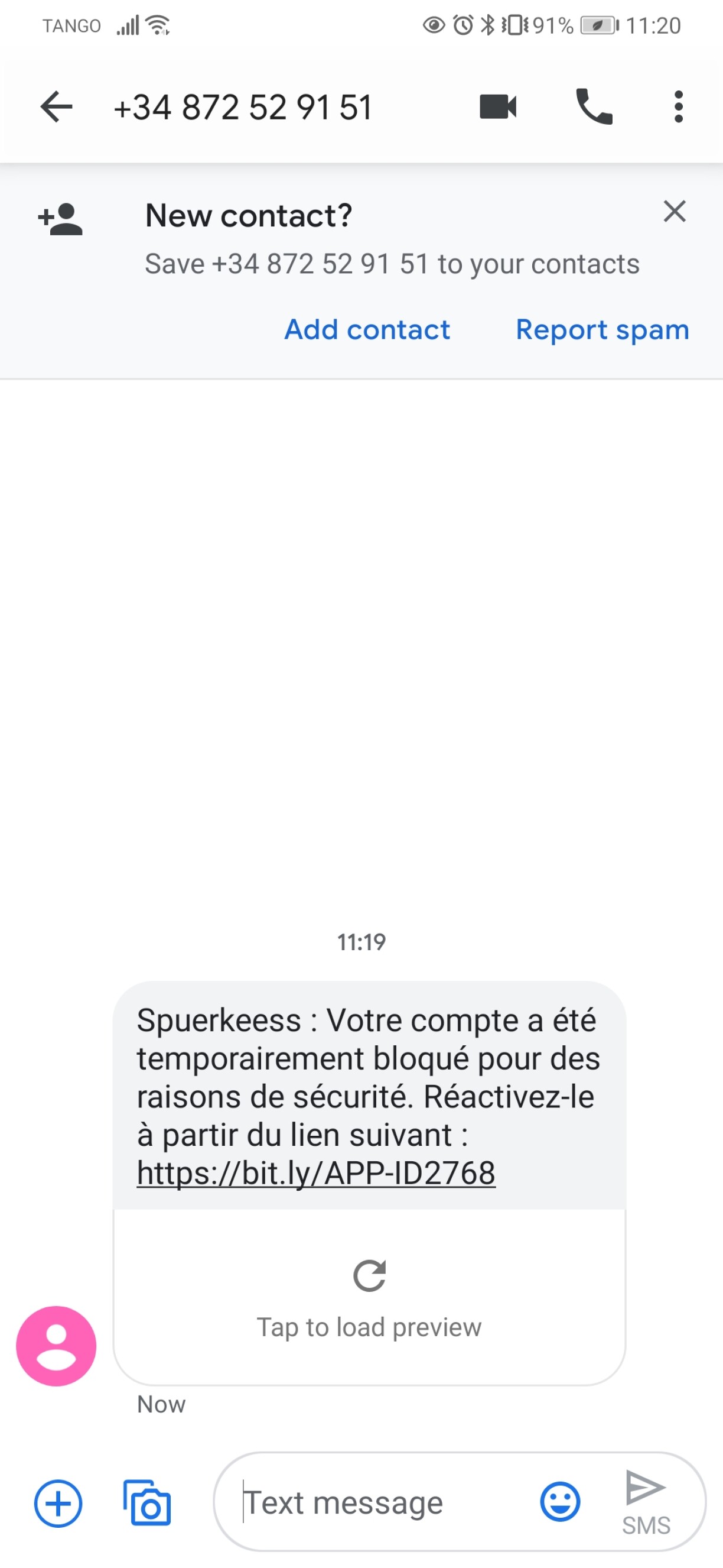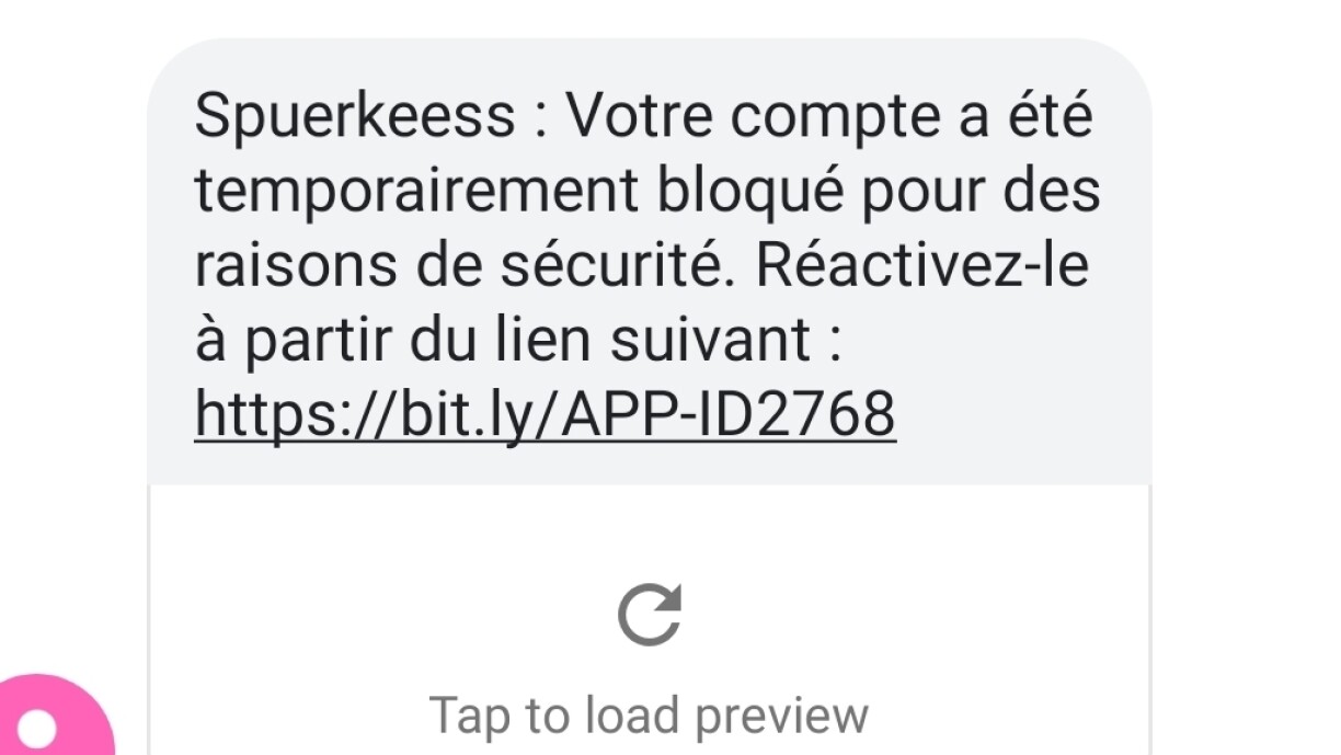 Bei der "Spuerkeess"-Arnaque behaapten déi Kriminell, datt de Kont temporär gespaart ass an een deen iwwert e Link an der SMS nees fräischalte kann. Bis ewell krute mir dës SMS vun enger Nummer mat spuenescher Virwal (+34).
