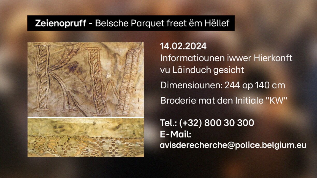 Besonnesch Persounen, déi sech mat Broderie auskennen, si gebieden, sech ze mellen. Dat iwwer d’Mailadress “avisderecherche@police.belgium.eu” oder ënnert der Telefonsnummer (+32) 800 30 300.