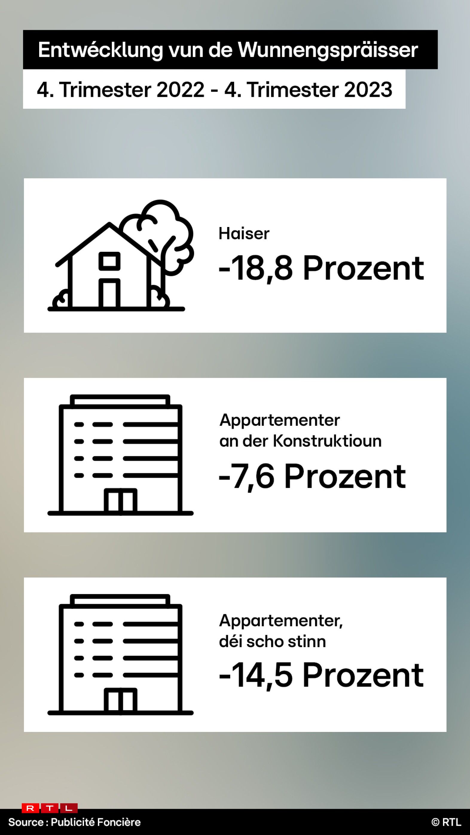 Nei Chifferen zum WunnengsmaartPräisser vum Logement gi weider erof, -18,8 Prozent fir al Haiser
