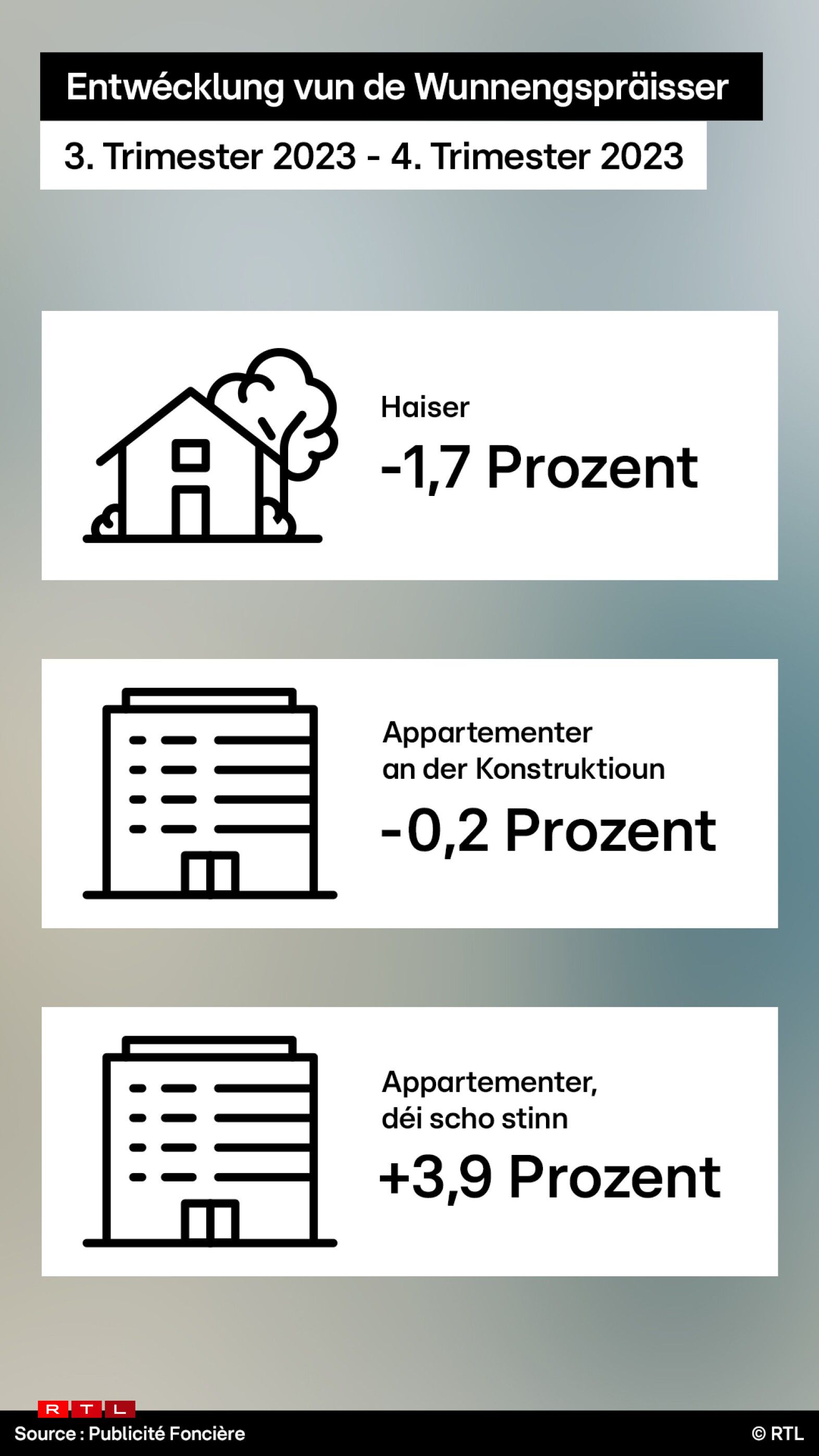 D'Präisser vun de Logementer waren Enn zejoert méi niddereg ewéi Enn 2022. Vum drëtten op dat véiert Trimester 2023 gouf et allerdéngs eng Stabilisatioun.