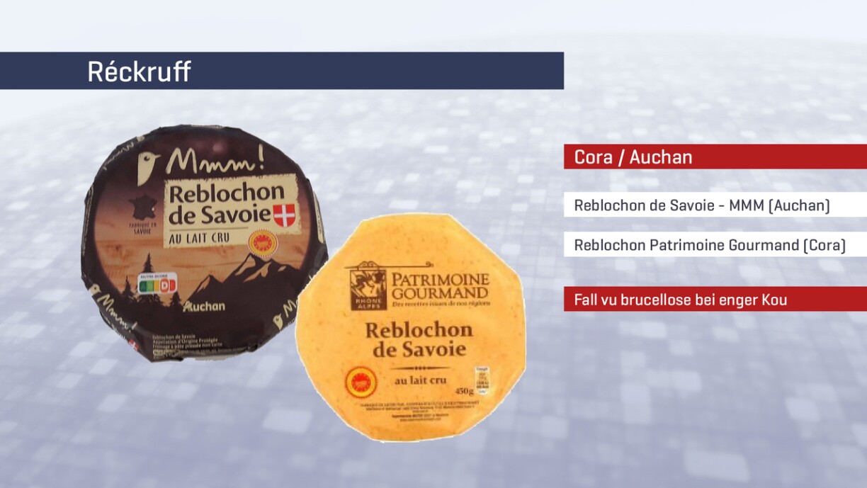 RéckruffReblochon de Savoie vun Auchan a Patrimoine Gourmand Verdacht op Brucellose