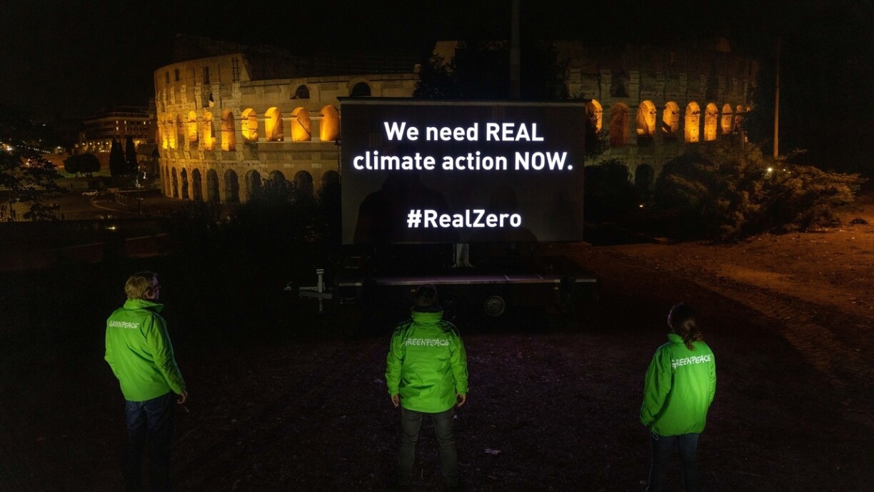 Luxemburg, den 29. Oktober 2021 - Im Vorfeld des G20-Gipfels am 30. und 31. Oktober in Rom erinnerten Greenpeace-AktivistInnen gestern Abend die Staats- und Regierungschefs der größten Volkswirtschaften der Welt, dass Kompensationsmechanismen für Treibhausgasemissionen der neue Klimaschwindel sind und gefährliche Folgen haben. Der G20-Gipfel findet während der offiziellen Eröffnung der COP26 statt, die an diesem Wochenende beginnt. Greenpeace Luxemburg erwartet von der luxemburgischen Regierung, dass sie sich bei der Auslegung von Artikel 6 des Pariser Abkommens gegen globale Kohlenstoffmärkte und Kompensationsmechanismen für Treibhausgase ausspricht.