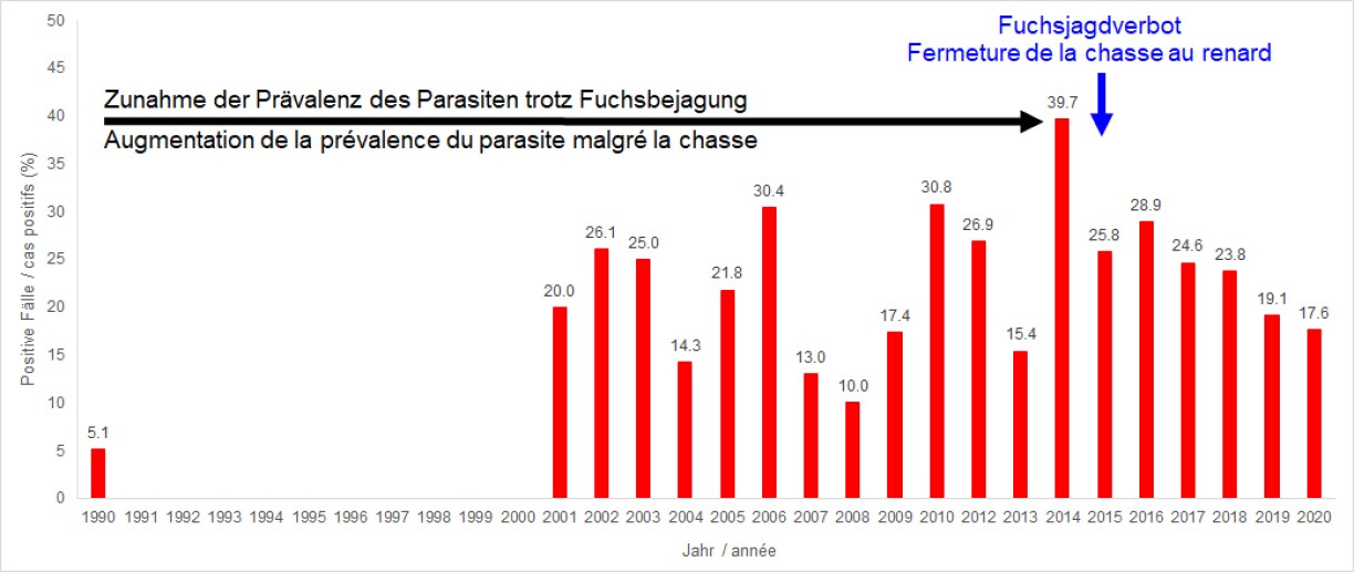 Des Weiteren wurde im Großraum Nancy eine Studie durchgeführt, welche Ende 2017 in der internationalen wissenschaftlichen Fachzeitschrift „Preventive Veterinary Medicine" veröffentlicht wurde und neue interessante Erkenntnisse zum Fuchs, zum Abschuss von Füchsen und dessen Einfluss auf das Vorkommen des Kleinen Fuchsbandwurms lieferte. Die Resultate dieser Studie zeigen, dass 1. der massive Abschuss von Füchsen keinen messbaren Einfluss auf die Fuchsdichte hat, was sich z.T. dadurch erklärt, dass die Populationsstruktur zerstört wird und mehr Jungfüchse überleben und die frei gewordenen Reviere besetzen, und 2. mit der Erhöhung des Fuchsabschusses die Prävalenz des Fuchsbandwurms bei den Füchsen stark anstieg, welches sich mit dem höheren Anteil an jüngeren Füchsen im Bestand erklärt, die anfälliger für den Parasiten sind.