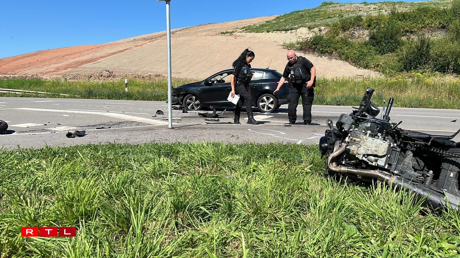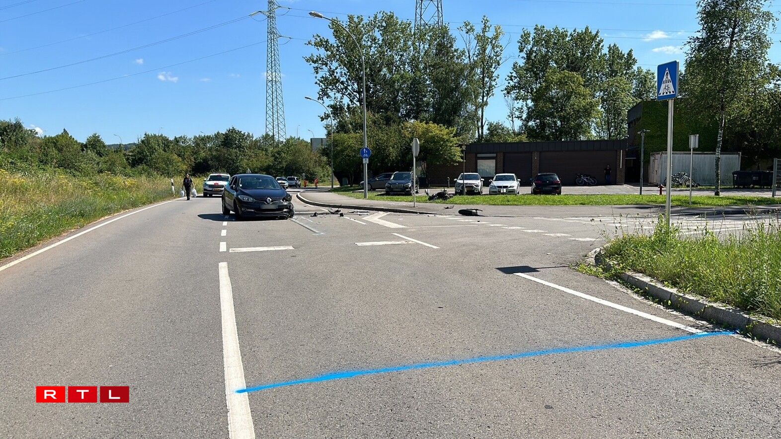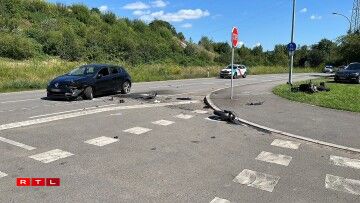 Op der Héicht vun der Hausnummer 53 krute sech en Auto an e Moto ze paken. D’Strooss huet wärend de Rettungs- an Opraumaarbechte misse komplett fir den Trafic gespaart ginn. Och d’Police judicaire souwéi hiren technesche Service goufen op d’Plaz geruff.