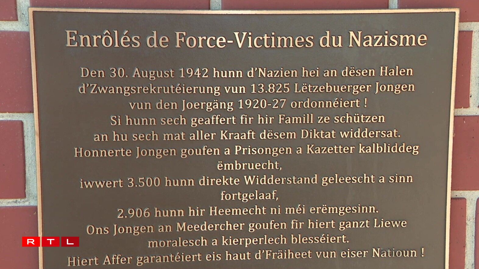 82 Joer ass et hir, datt d’Nazien d’Zwangsrekrutéierung ordonéiert hunn. Et wier den Ufank vun engem vun den däischtersten Kapitelen an der Geschicht vu Lëtzebuerg am Zweete Weltkrich gewiescht, huet den Josy Lorent, President vun der Zwangsrekrutéierten-Federatioun, betount: “D’Zwangsrekrutéierung, vun där direkt oder indirekt all Famill zu Lëtzebuerg betraff war, gëtt zu Recht, als dat gréisste Krichsverbrieche vun den Nazien un der Lëtzebuerger Jugend duergestallt.”