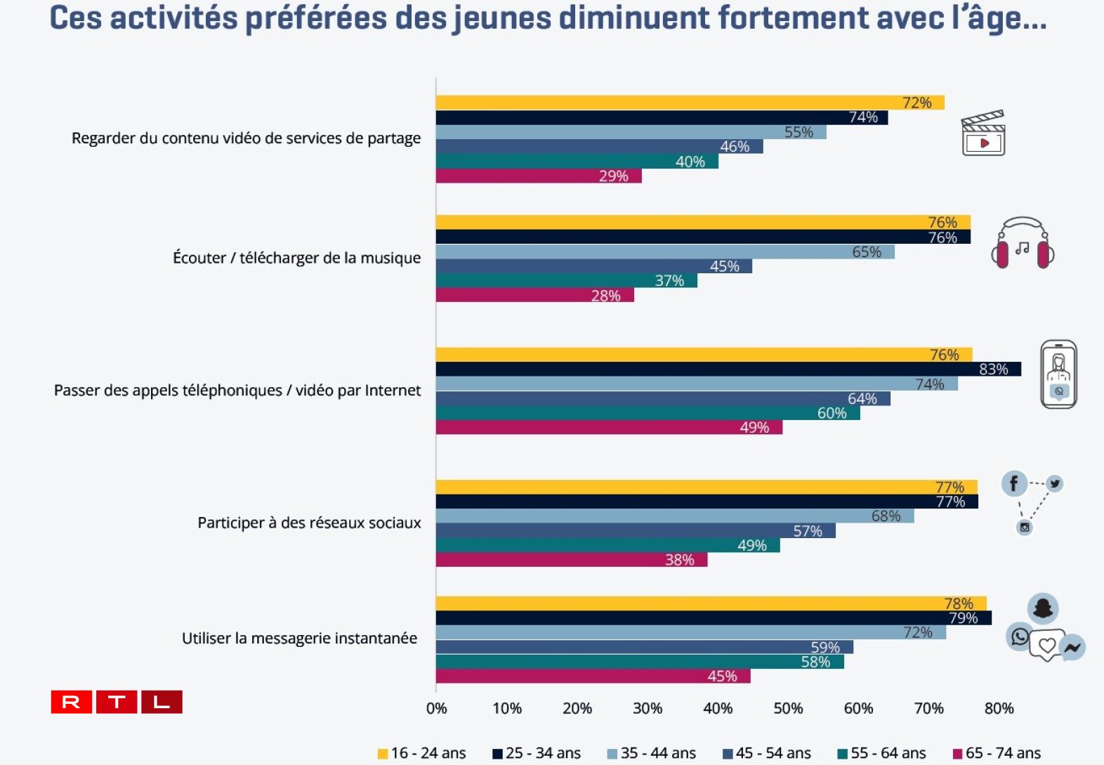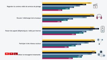 78 Prozent vun deene Jonke ginn un, am Internet Instant-Messaging-Déngschter ze notzen. Knapp dohanner kommen der Rei no déi sozial Reseauen, d’Uruffe respektiv Video-Callen, d’Lauschtere vu Musek an d’Kucke vu Videoen. Mam Alter geet d’Lauschtere vu Musek iwwert d’Internet am stäerksten no ënnen, an zwar vu 76 Prozent an der Altersklass tëscht 16 a 24 Joer op 28 Prozent bei de Persounen tëscht 65 a 74 Joer.