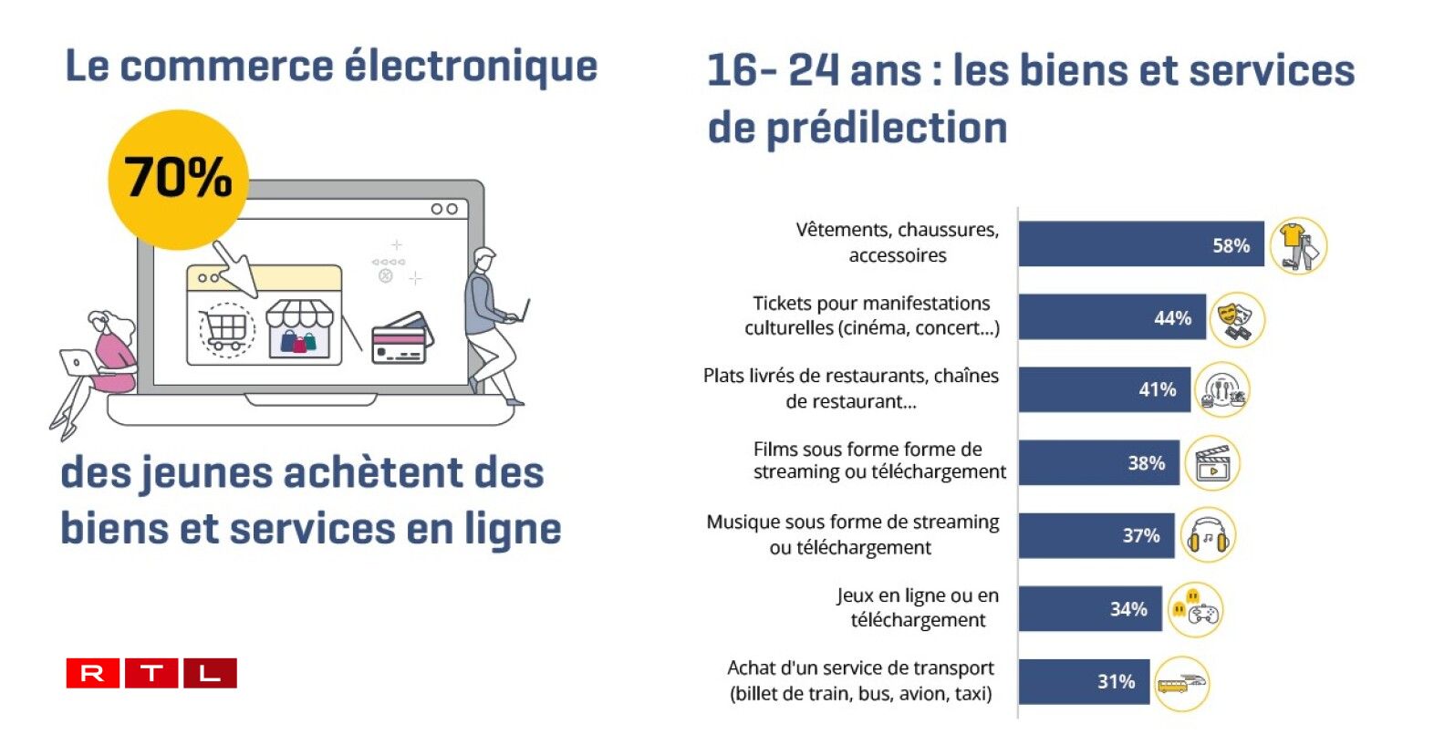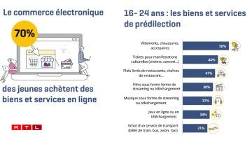 70 Prozent vun deene Jonke kafen am Internet an. Op Plaz eent vun deene Saachen, déi akaaft ginn, leie mat 58 Prozent Kleeder, Schong an Accessoiren. Op de Plazen zwee an dräi kommen Tickete fir kulturell Manifestatiounen an Iessen, dat heem geliwwert gëtt.