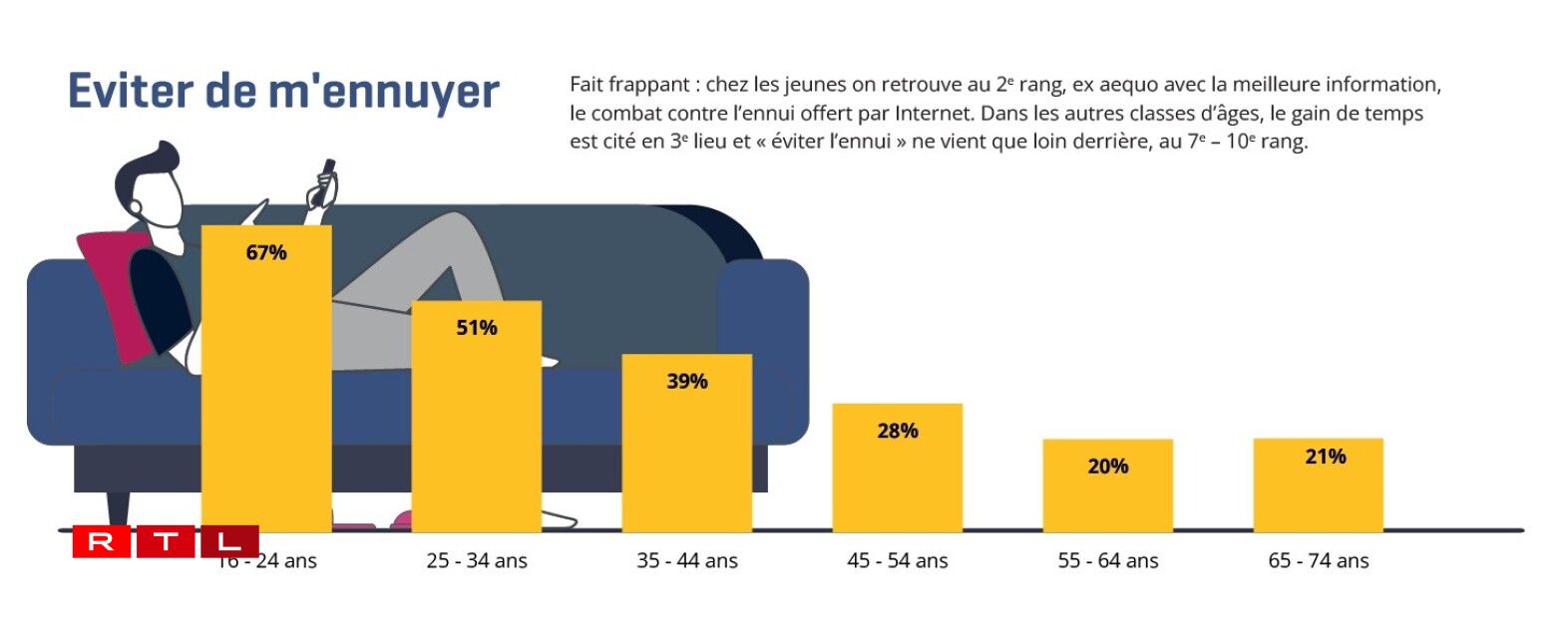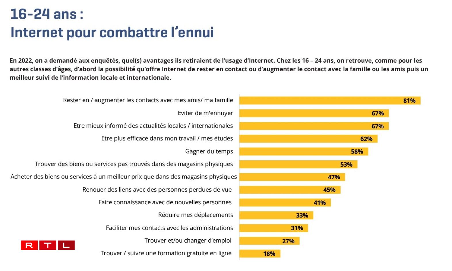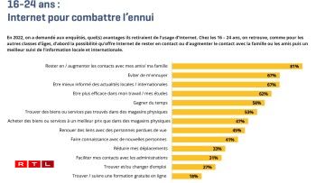 A Kontakt mat der Famill a Frënn bleiwen, respektiv de Kontakt verbesseren: Mat 81 Prozent ass dat den Haaptgrond, firwat Jonker den Internet notzen. Déi zweete Plaz deele sech zwee zimmlech ënnerschiddlech Grënn. Op jee 67 Prozent kommen engersäits d’Informéieren iwwert lokal an international Neiegkeeten an anerersäits de Kampf géint d’Langweil. Am Verglach mat allen aneren Altersgruppe fält op, datt d’Evitéiere vu Langweil duerch d’Notze vum Internet bei deene Jonke vill méi staark ausgepräägt ass. An der Altersgrupp tëscht 55 a 64 Joer sinn et zum Beispill just 20 Prozent, déi dee Grond uginn.