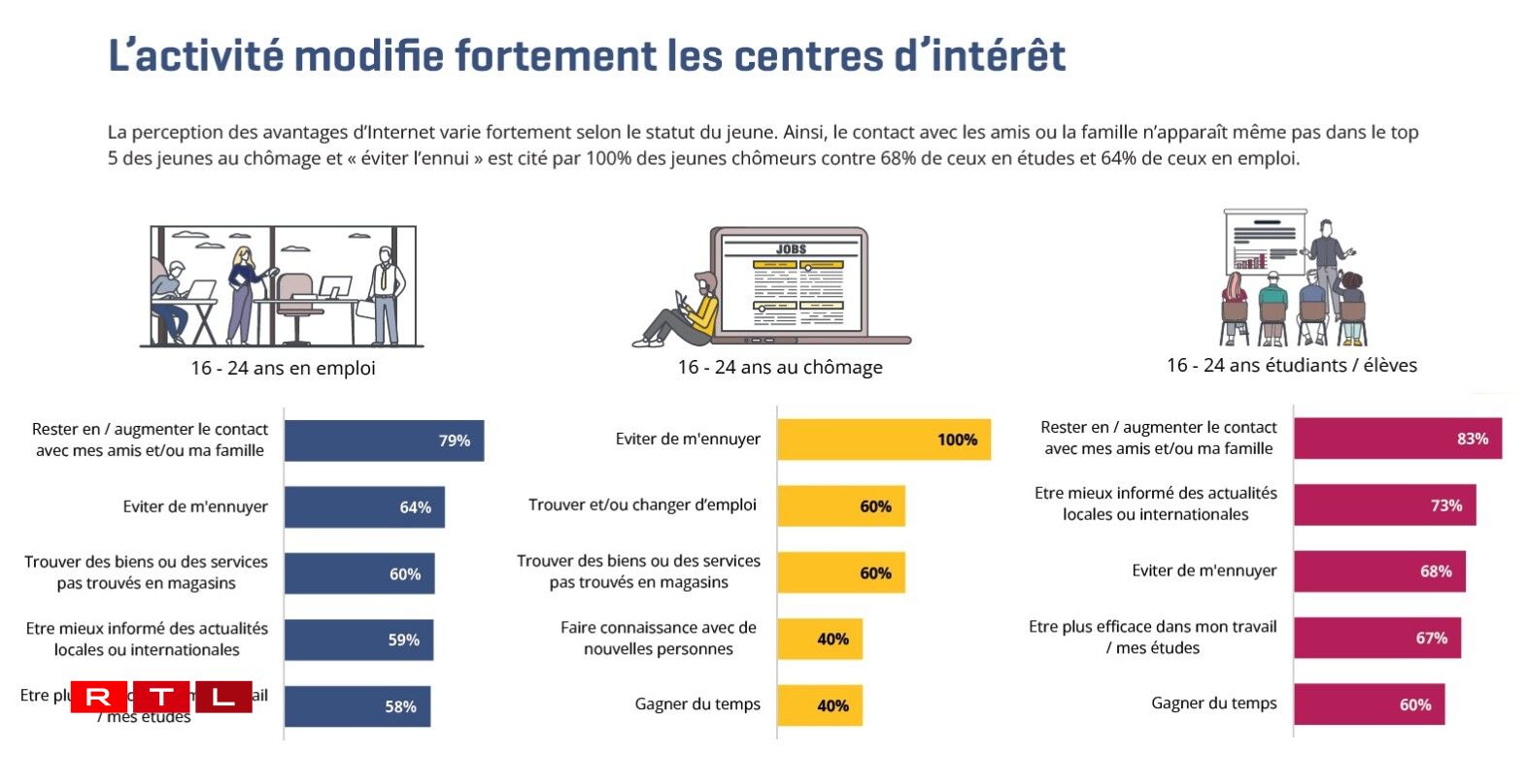 Den Internet ass aus eisem Alldag nëmmen nach schwéier ewechzedenken. Vill Aktivitéiten, sief et am Beruffs- oder am Privatliewen, spille sech am World Wide Web of. D’lescht Joer hat de Statec eng Etüd an Optrag ginn, fir ze analyséiere wéi Jonker am Alter tëscht 16 a 24 Joer den Internet notzen. D’Resultater weisen, datt et net eleng ëm Produktivitéit geet.