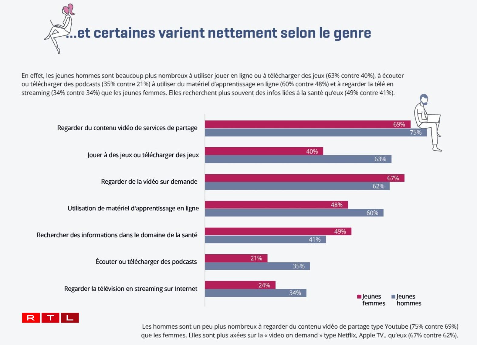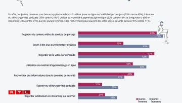 Tëscht deenen zwee Geschlechter gëtt et iwwerdeems Ënnerscheeder bei der Notzung vum Internet. Sou spille jonk Männer däitlech léiwer Videospiller wéi Fraen an deem selwechten Alter, dat mat 63 géint 40 Prozent. Frae sichen dofir méi dacks no Informatiounen aus dem Gesondheetsberäich, dat mat 49 zu 41 Prozent.