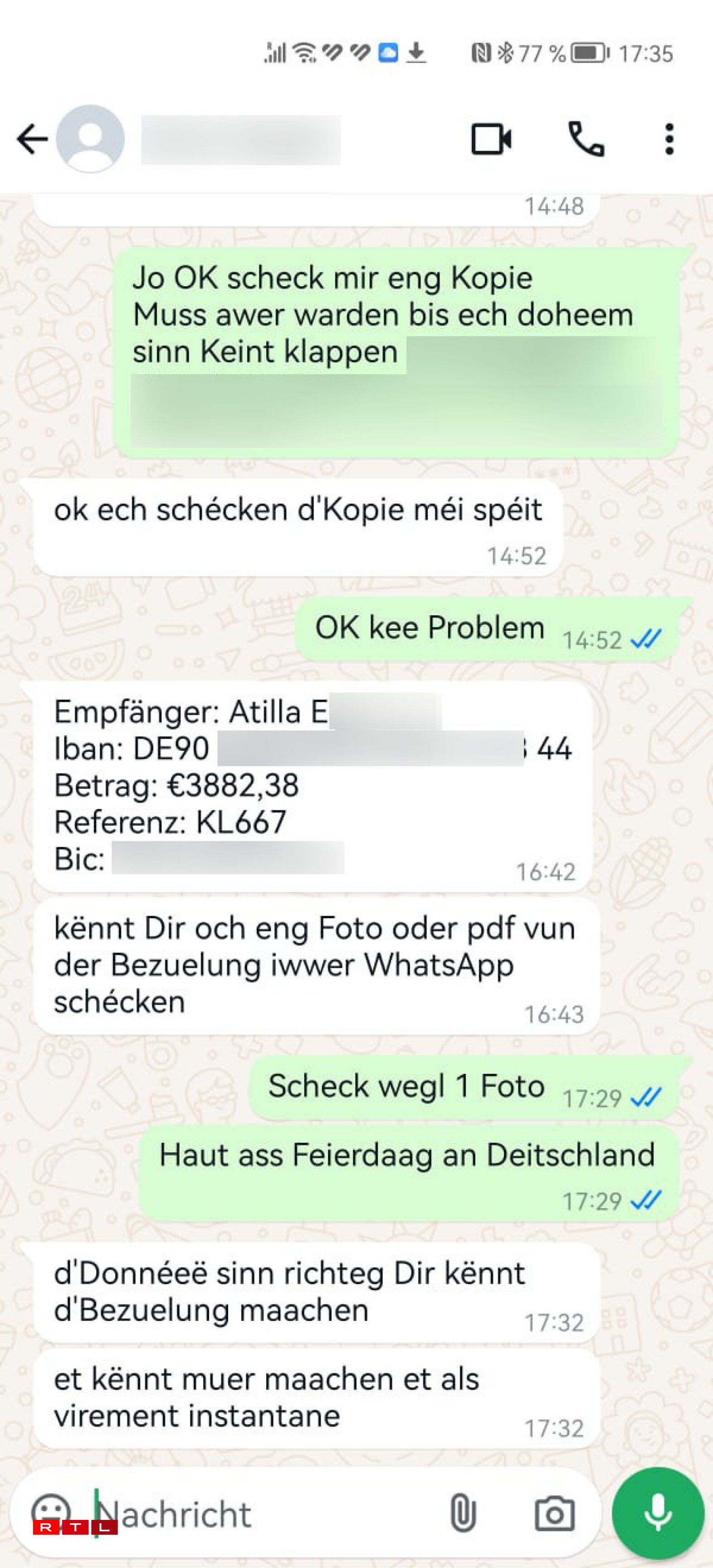 D’Iwwerweisung soll bei e gewëssen Atilla E. goen, op en däitsche Kont. En Total vun 3.882,38 Euro. Do ass mäi Papp stutzeg ginn. “Du géifs mech ni froen, esou vill Suen op e frieme Kont ze iwwerweisen, ouni mat mer geschwat ze hunn”, zielt mäi Papp mir. Och, datt ech eng Confirmatioun fir d’Iwwerweisung géif froen, wier komesch. Zesumme mat menger Mamm huet hien decidéiert, datt hei eng faul wier an huet emol probéiert, op meng “al”, also meng richteg Handysnummer, unzeruffen.