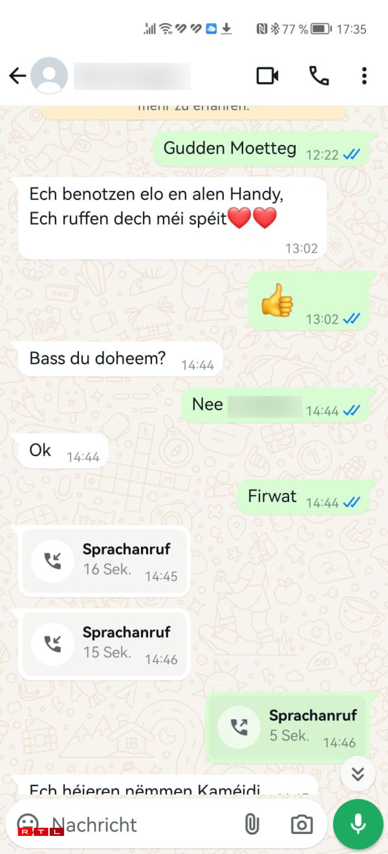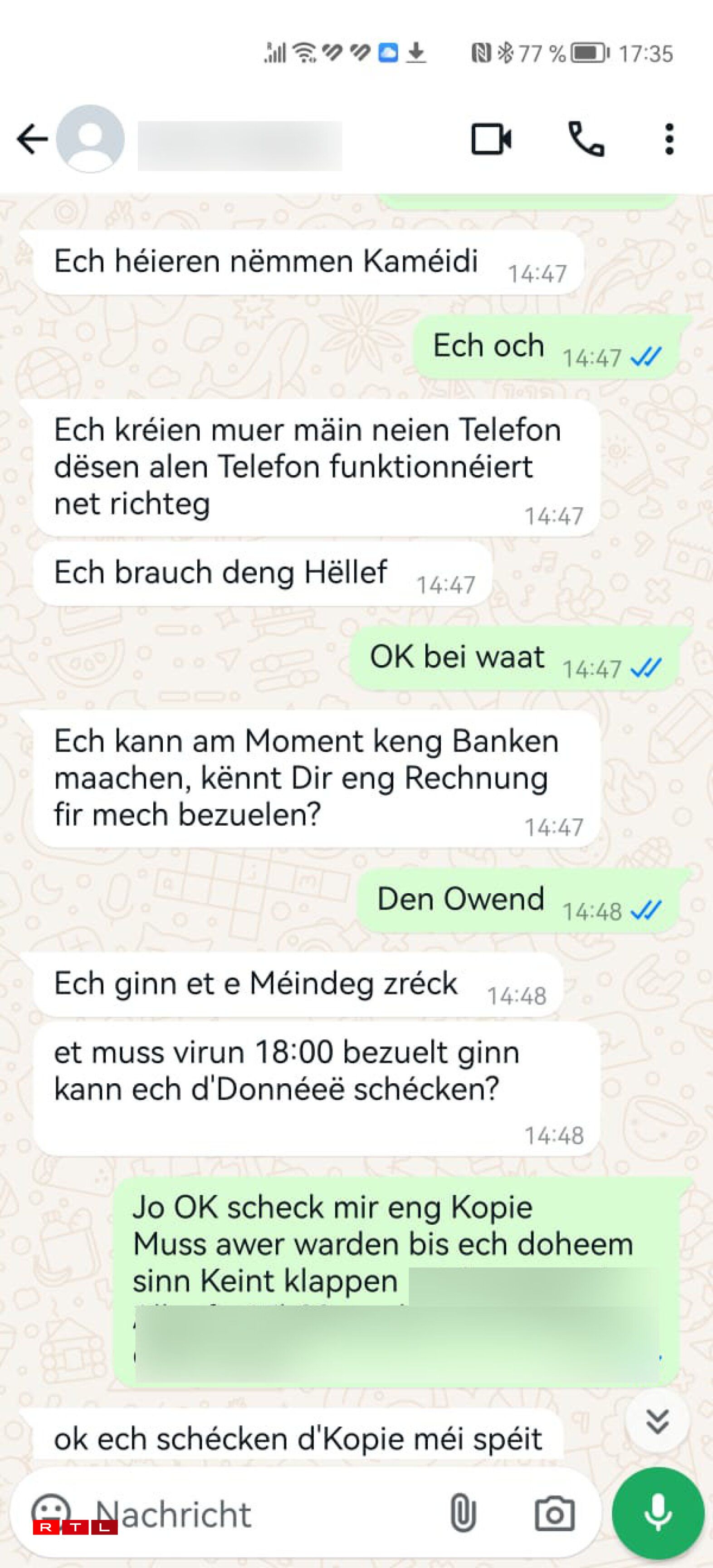 Esou ass d’Kommunikatioun weider op WhatsApp gaangen. De falsche Kevin huet dann och “probéiert”, unzeruffen, fir nach méi legitim ze wierken, ma wuel gouf et mam “alen Handy”, dee kuerz virdrun erwäänt gouf, Problemer. Et huet ee just e Rauschen héieren. Iwwregens héiert ee genau dëst Rauschen och, wann een net iwwer WhatsApp op déi Nummer urifft. Eng Persoun hieft op, et mécht Kaméidi. “Ech kréie muer mäin neien Telefon, dësen alen funktionéiert net richteg”, ass de Constat vum Onéierlechen, deen direkt dono e Problem ernimmt. Hie muss Suen iwwerweisen an huet aktuell keng Méiglechkeet dat ze maachen. Ob de Papp him do aushëllefe kann?