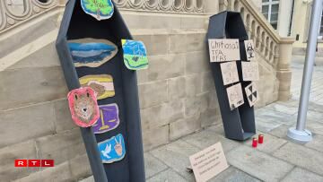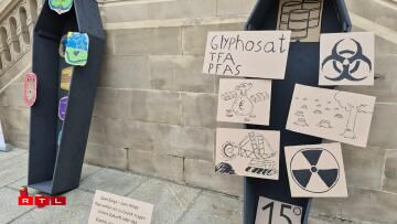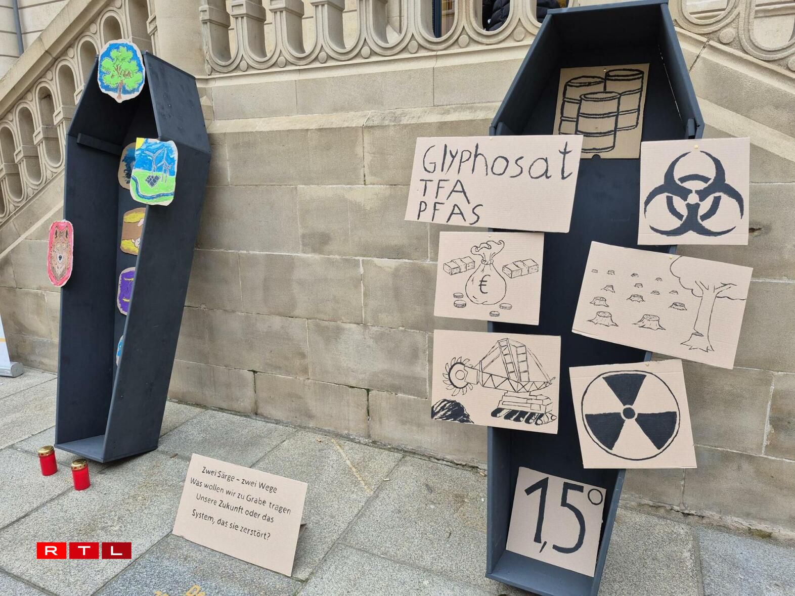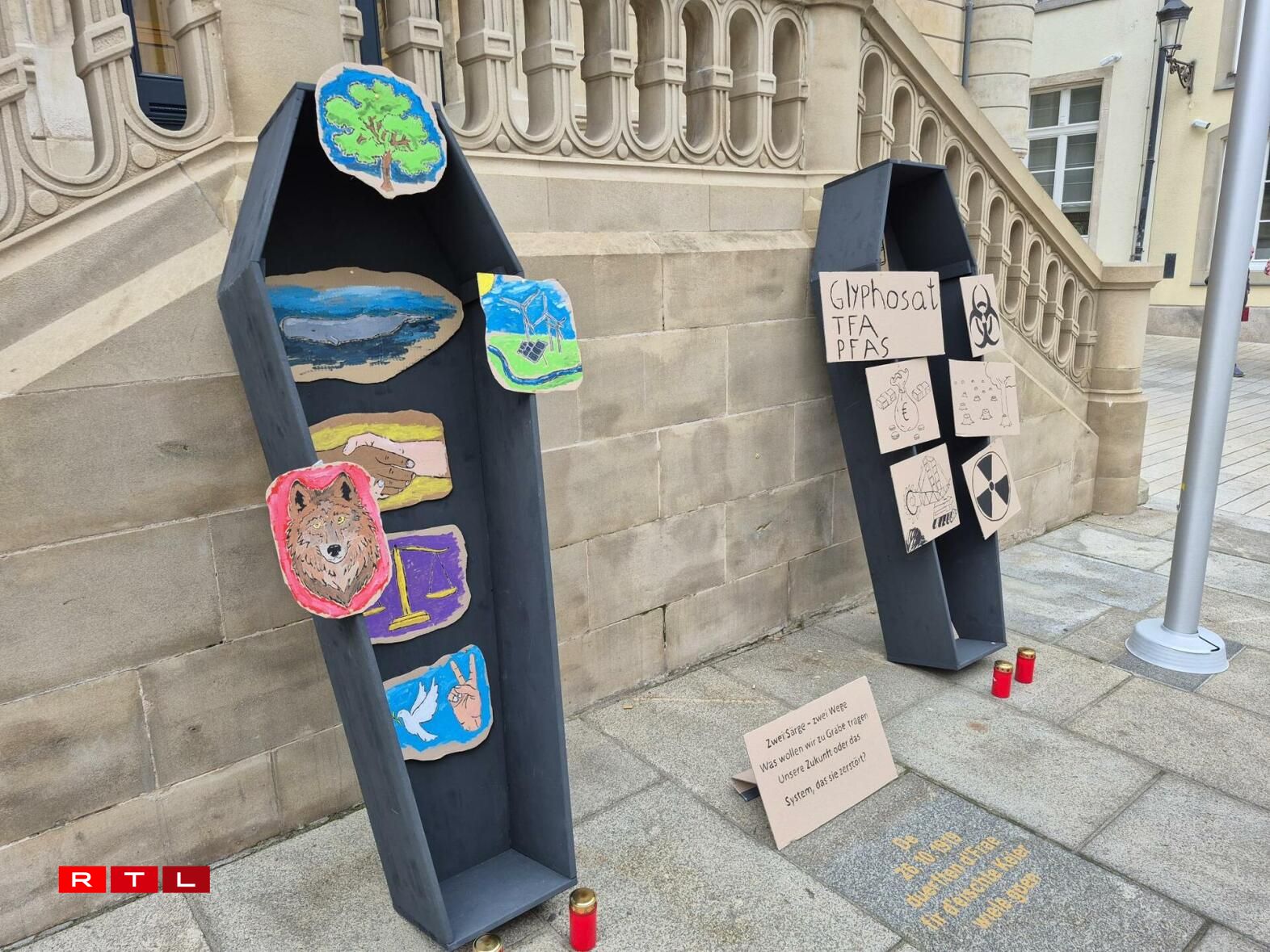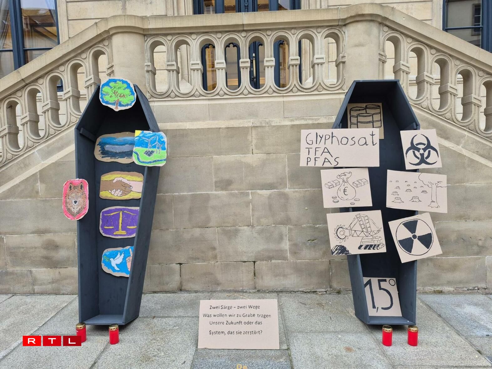 Am Kader vum internationale Klimastreik an der Weltklimakonferenz, déi de Moment a Brasilien ass, hunn déi Jonk zwou Doudeluede virun der Chamber opgestallt. Den Alex Uehmen vum move: