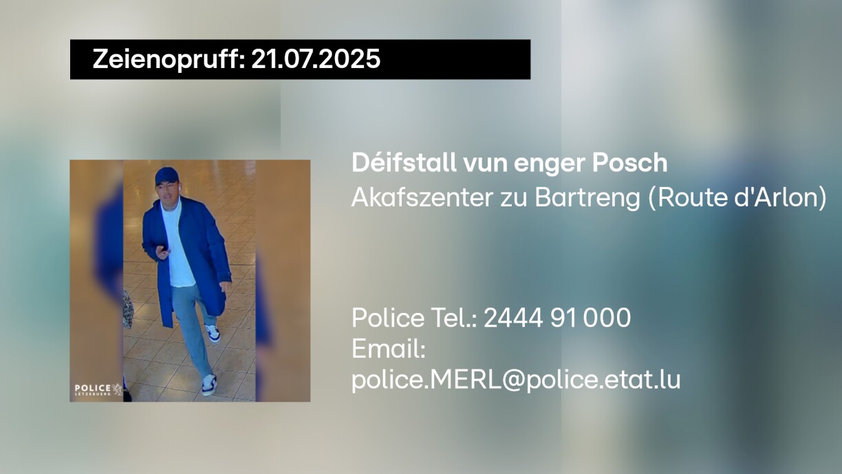 Konkreet geet et ëm eng Posch, déi den 21. Juli 2025 geklaut gouf. No engem éischten Zeienopruff vun der Police konnt ee vun den zwee Brigangen identifizéiert ginn. Nom Mann gëtt awer weiderhi gesicht.