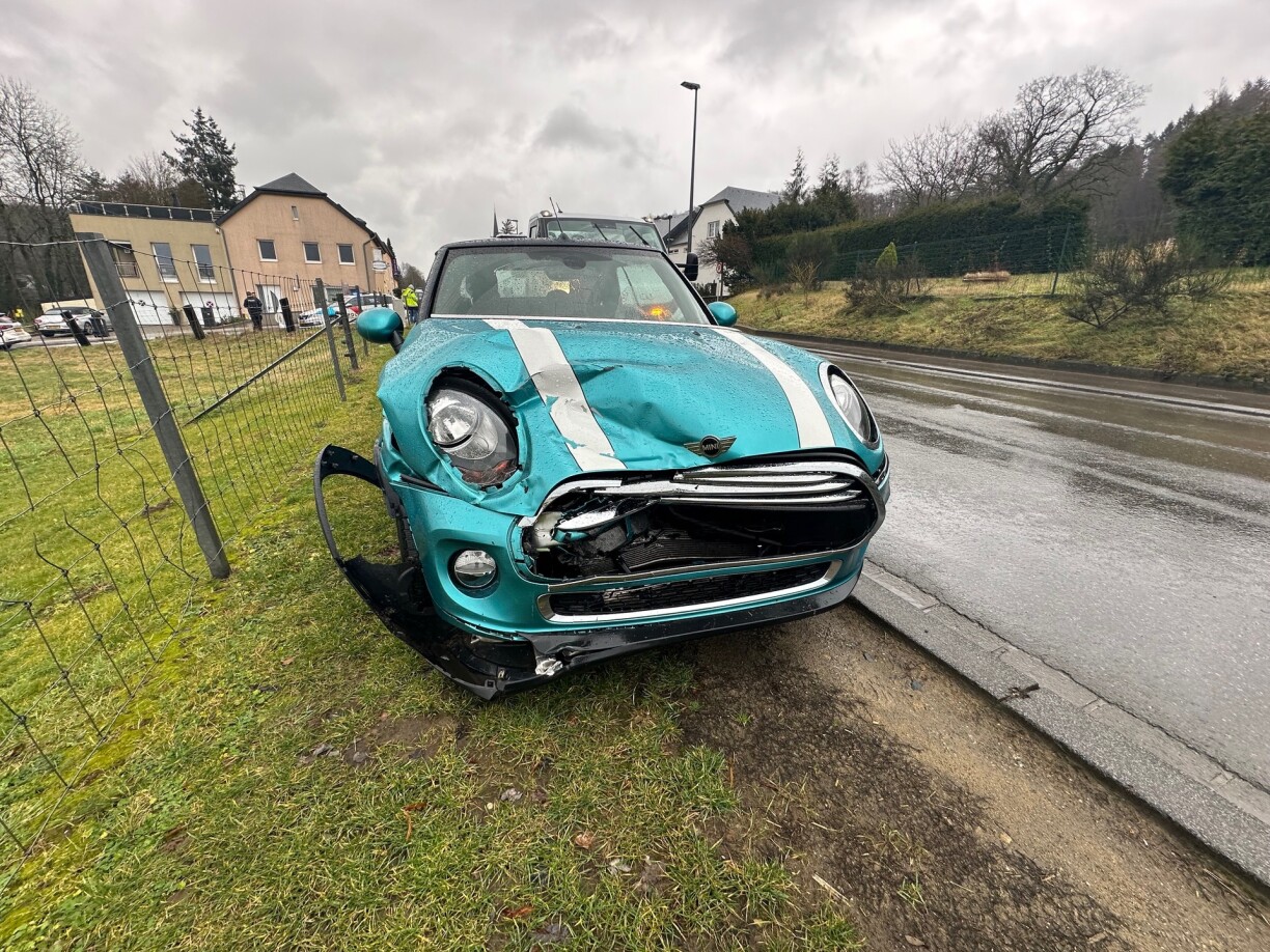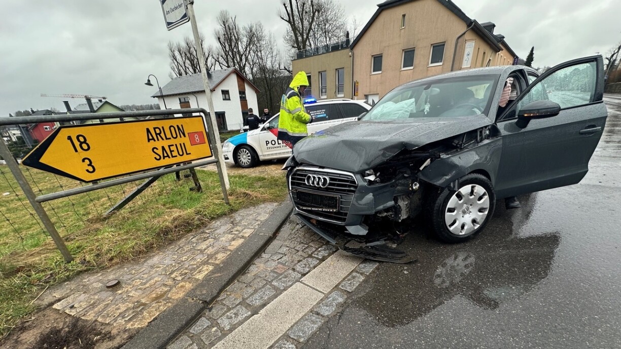 Géint 8.45 Auer war et nach eng Kollisioun tëscht zwee Autoen op enger Kräizung zu Bruch. Wärend dem Opraumaarbechte koum et zu Problemer am Trafic. Eng Persoun koum blesséiert an d’Spidol.