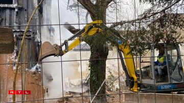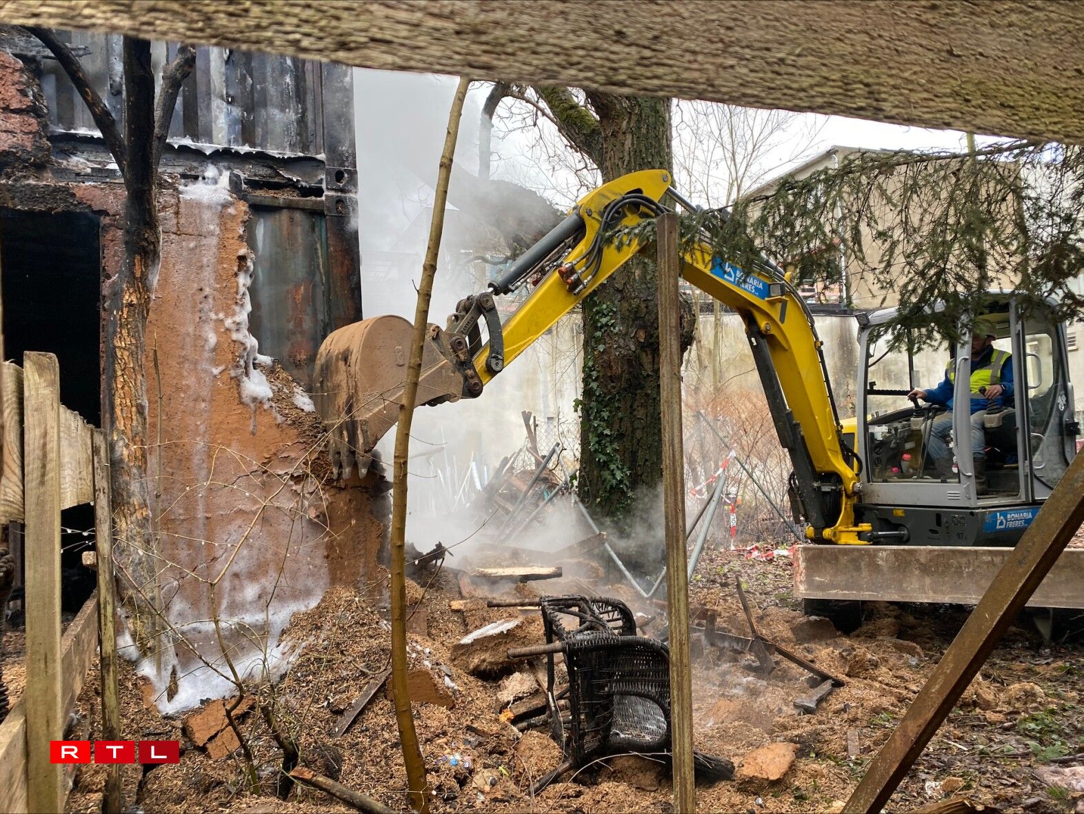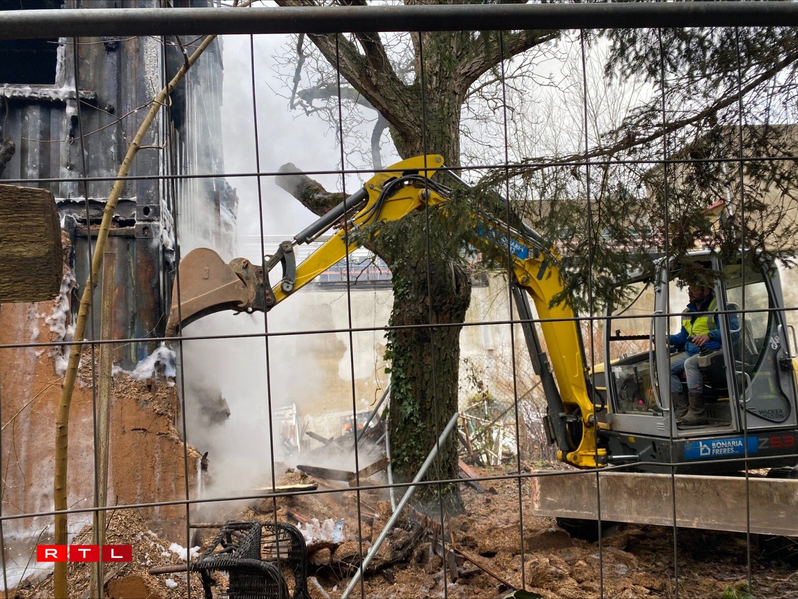 „De Bagger kënnt fir déi Fassad, déi aus Leem a Stréi besteet, erofzehuelen, fir dass mir direkt un de Container un déi metalle Wand drukommen. Wärenddeem de Bagger déi Fassad erofhëlt, sinn d‘Pompjeeën am Gaangen, Noläschaarbechten ze maachen.“