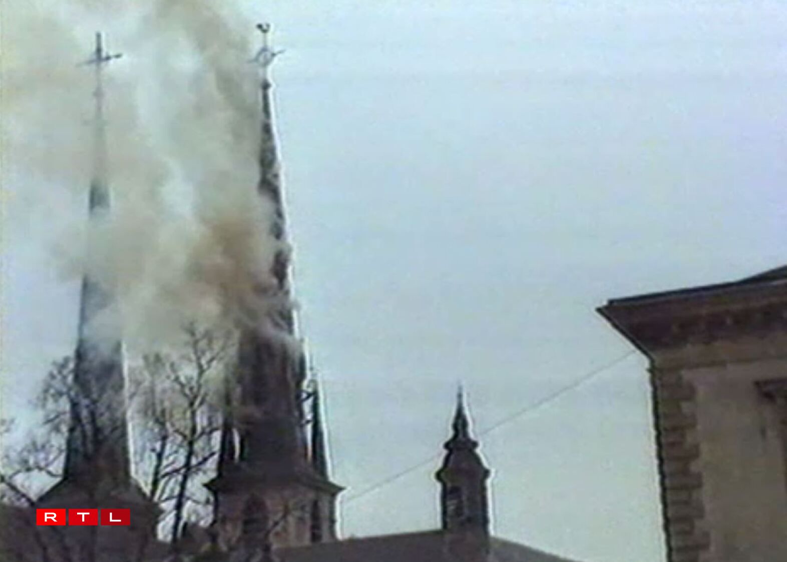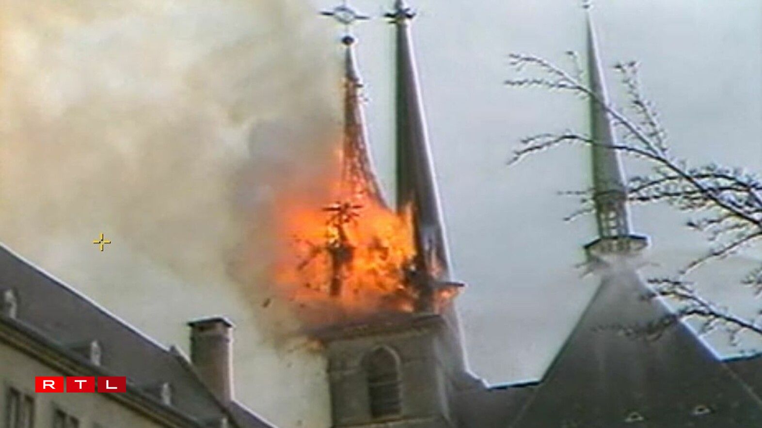 Den Tuerm gouf deemools komplett zerstéiert, genee wéi d’Klackespill mat sengen 37 klengen Klacken, wéi och 5 vun de 6 grousse Klacken. Dat war deemools, ee Mount virum Besuch vum Poopst Jean-Paul II war dës Tragedie eng grouss Erausfuerderung fir déi Lëtzebuerger Stater Pompjeeën.