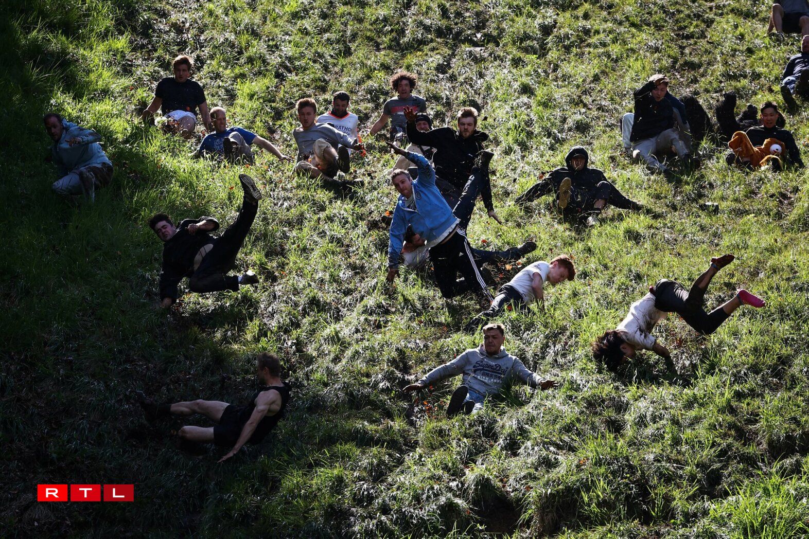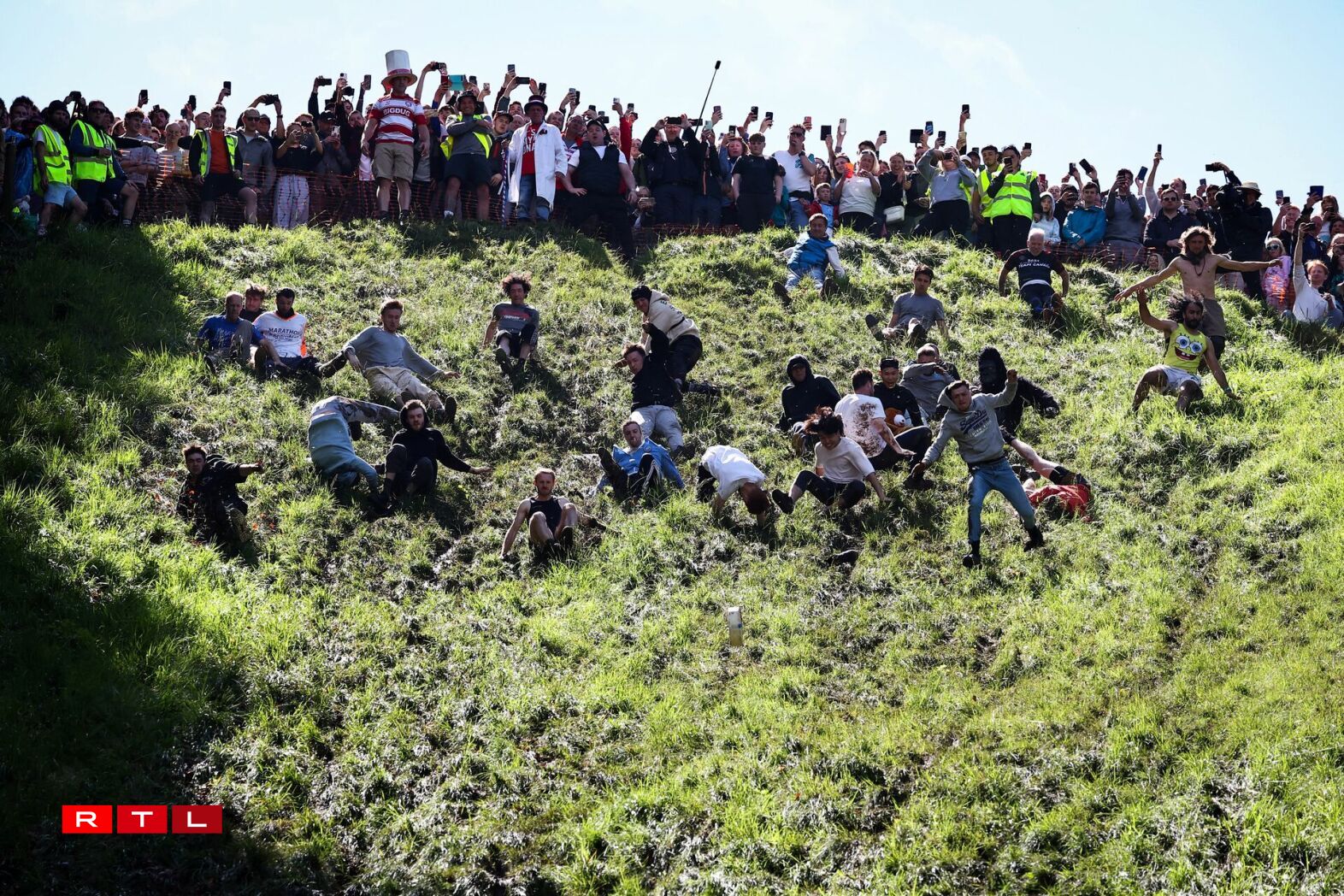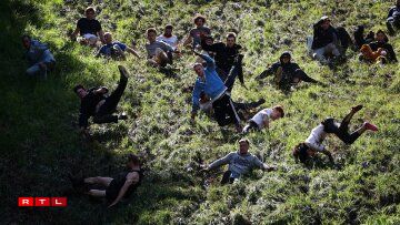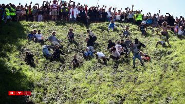 Et ass ee kuriéise Concours am Gloucestershire, bei deem d'Leit engem Kéis, deen de Bierg erofrullt, nolafen oder besser gesot, norullen.