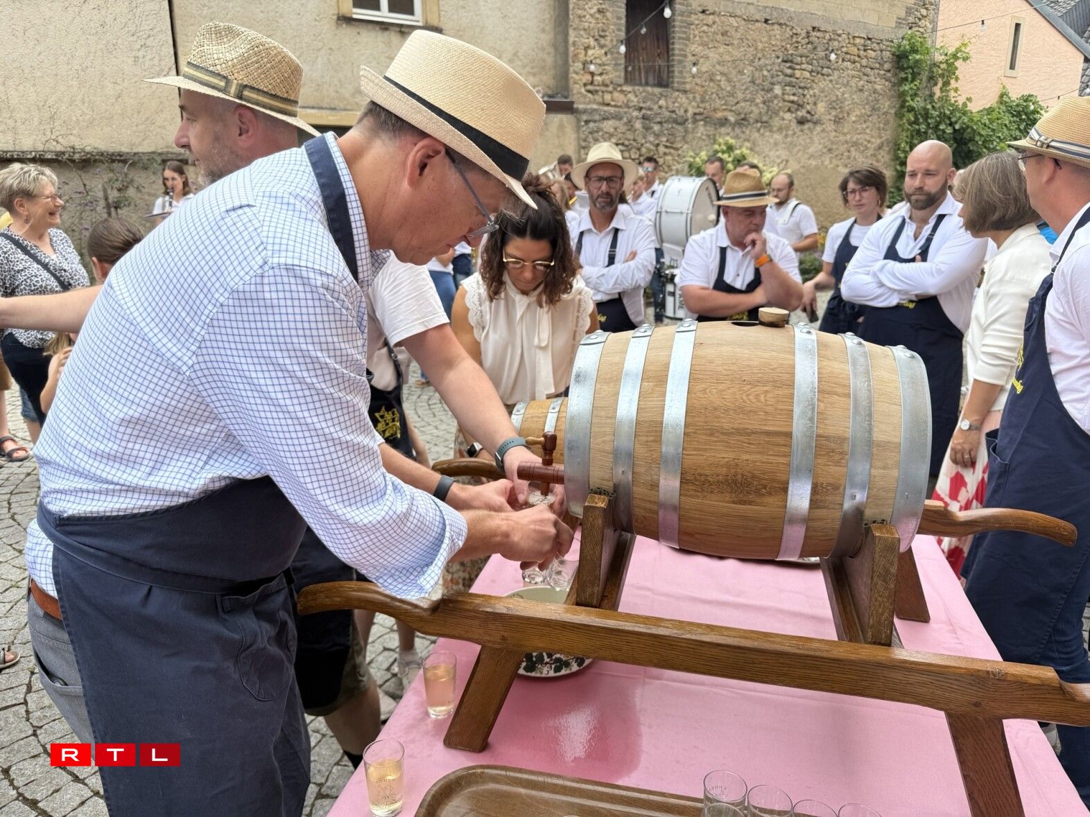 Zu Éinen dierf natierlech d’Glas Riesling net feelen, d’Duerf war an der Zäit d’Lëtzebuerger Héichbuerg vum Rivaner, haut steet d’ Cremant-Produktioun am Fokus, mat virun allem d’ Burgunder-Zorten.