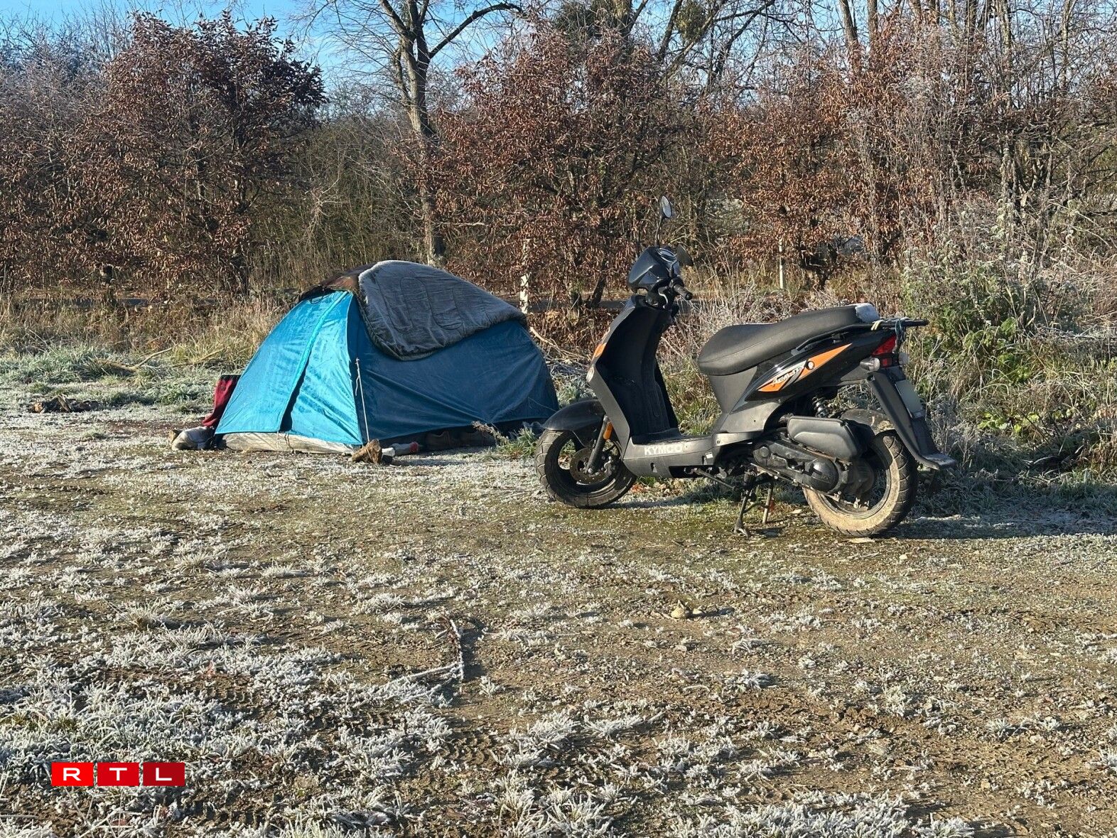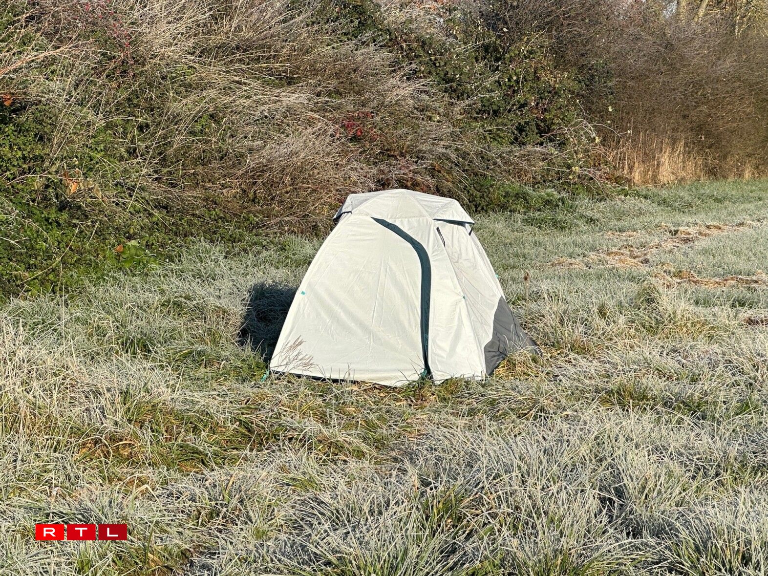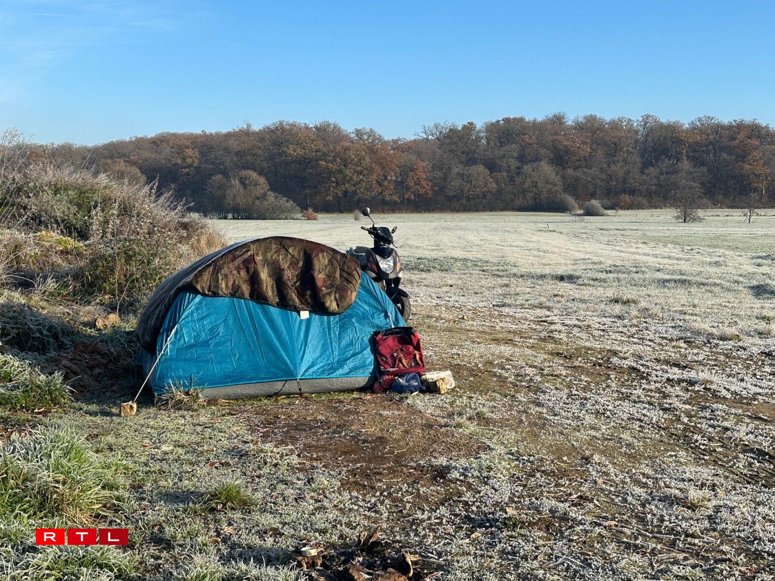 An de Felder tëscht Beetebuerg a Fréiseng, steet zanter e puer Wochen e klengt wäisst-grot Zelt. Hei wunnt den Denis S., 51 Joer, gebierteg vu Jork a Niedersachsen, just eng hallef Stonn vun Hamburg ewech.