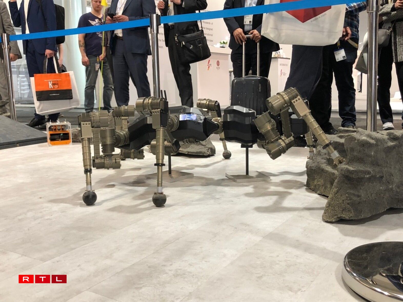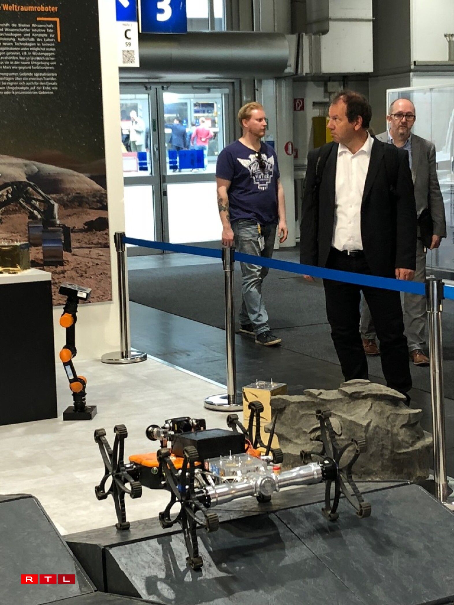 Wat fir de Client natierlech gutt ass. A just vis-à-vis e Pavillon, deen de ganzen Dag besonnesch vill Opmierksamkeet hat: Den däitsche Recherche-Zenter fir kënschtlech Intelligenz. Ganz futuristesch Roboter a Gestalt vun enger Ameis oder engem Af, awer och méi klassescher mat véier Rieder, déi awer dofir enorm villsäiteg agesat kënne ginn. Den Ingenieur Florian Cordes:
