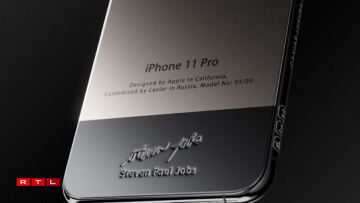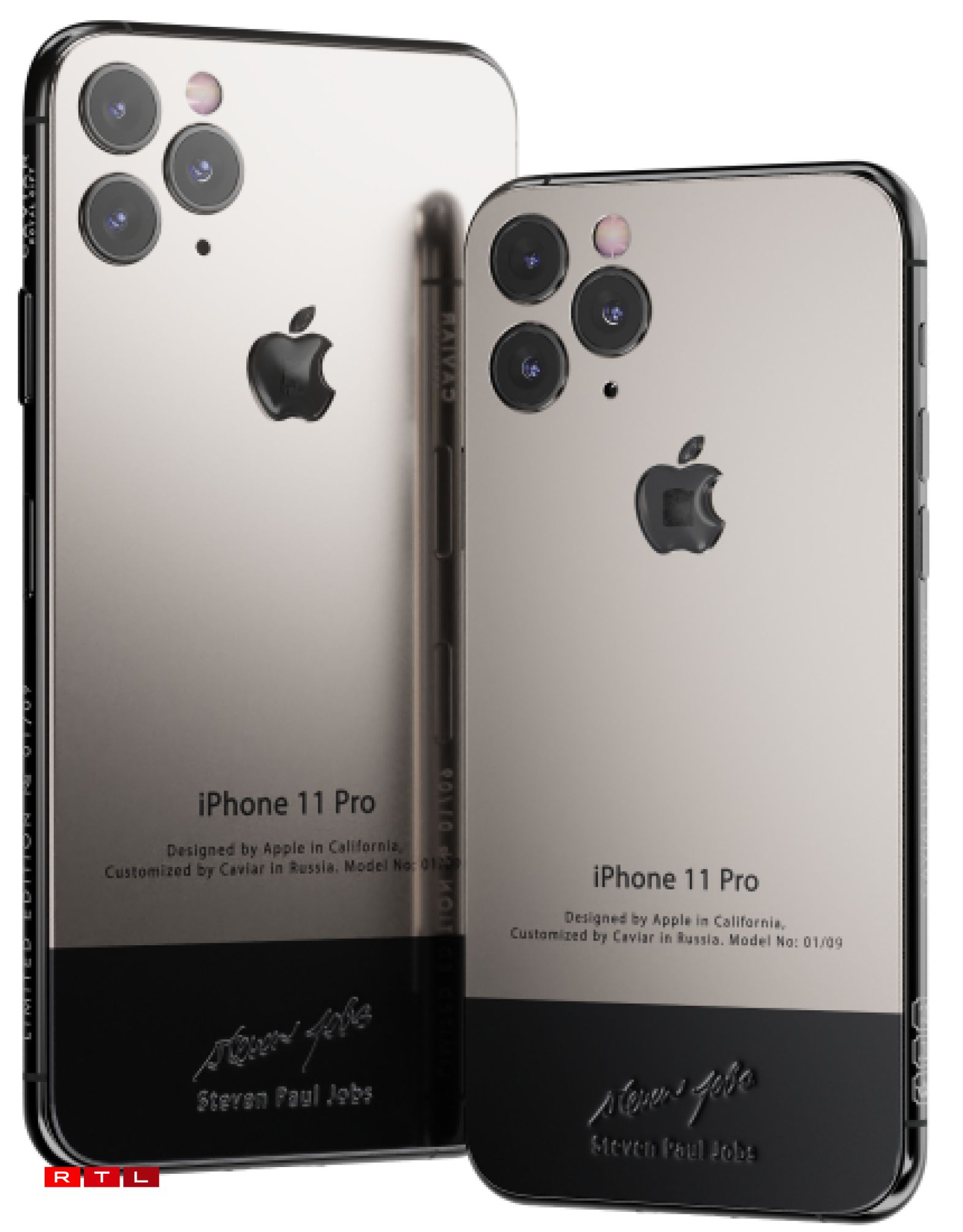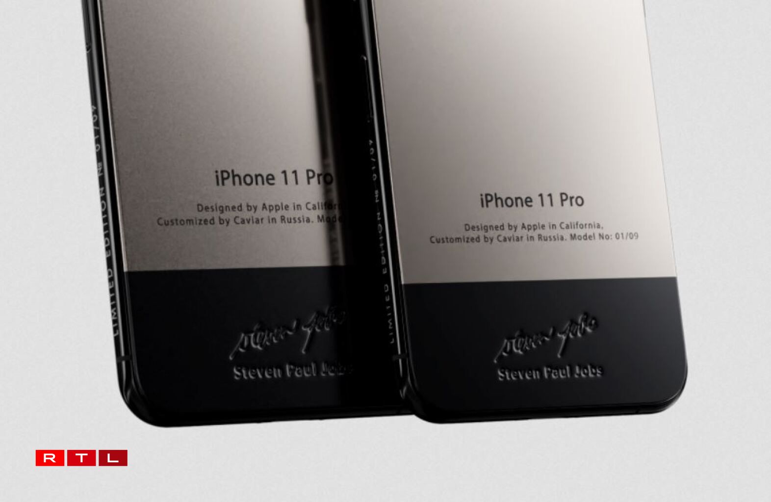 Besonnesch un dësem speziellen iPhone 11 Pro ass d’Material aus purem Titan an e personaliséiert Detail op der Récksäit, nämlech seng Ënnerschrëft, déi an den Apparat ageritzt gouf. D’Luxus-Mark ass beim Design esouguer nach e Krack méi wäit gaangen, an huet e Stéck vum populäre Steve-Jobs-Pullover an d’Mëtt vum Logo integréiert.