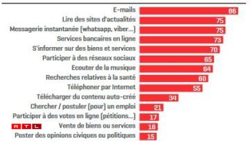 Déi eeler User verschécken éischter Mailen a consultéieren d’Aktualitéit. Sozial Reseaue si bei de Leit bis 55 Joer extrem beléift, besonnesch bei de Meedercher an de Fraen.