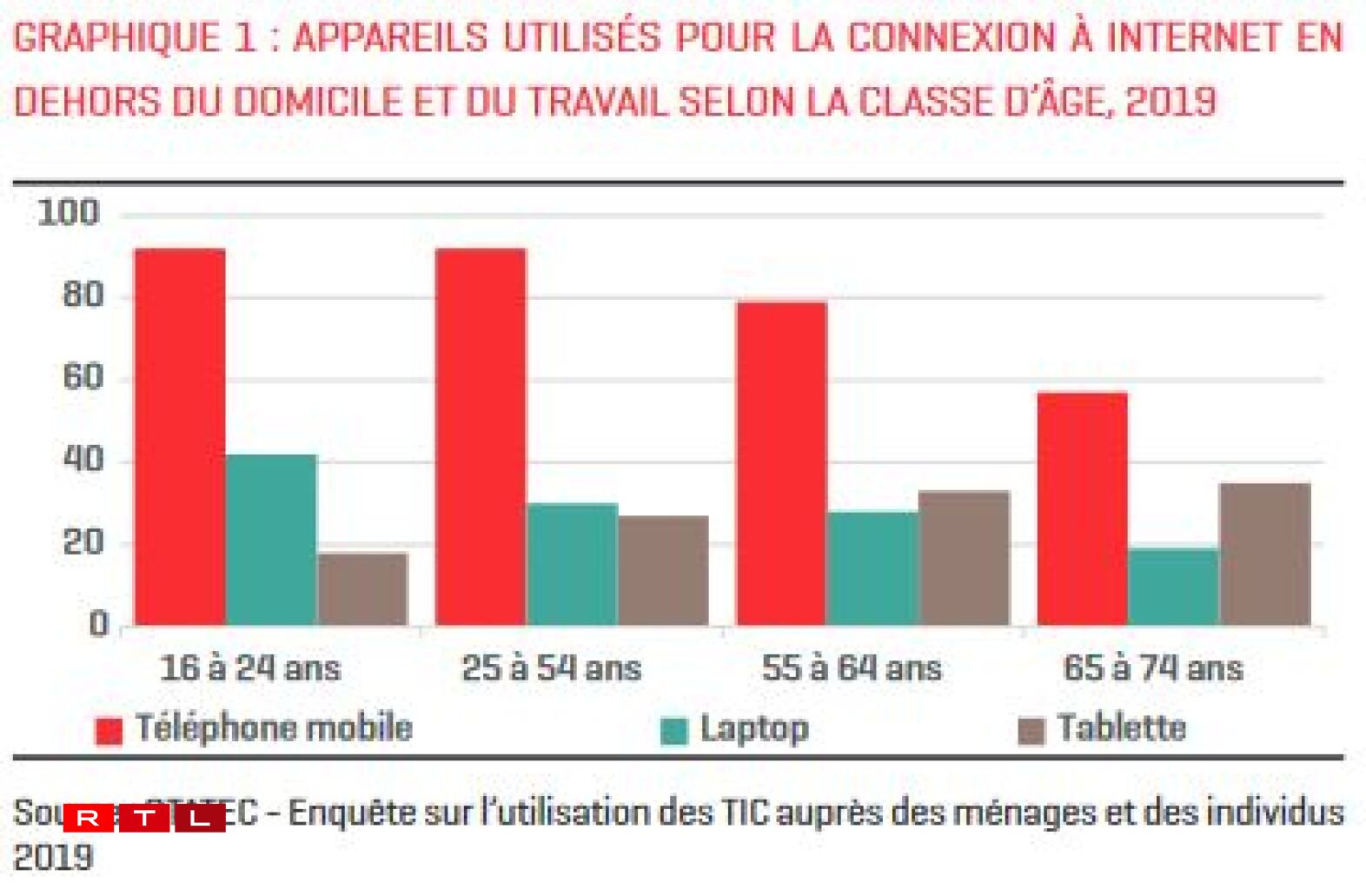 Nëmmen 11% vun all de Leit déi gefrot goufen hu geäntwert, dass si den Internet nëmmen Doheem an op der Aarbecht notzen. Et gëtt also zu 89% dobausse monter gesurft, déi Allermeescht via Handy, ausser bei de Senioren, déi et via d’Tablette maachen.