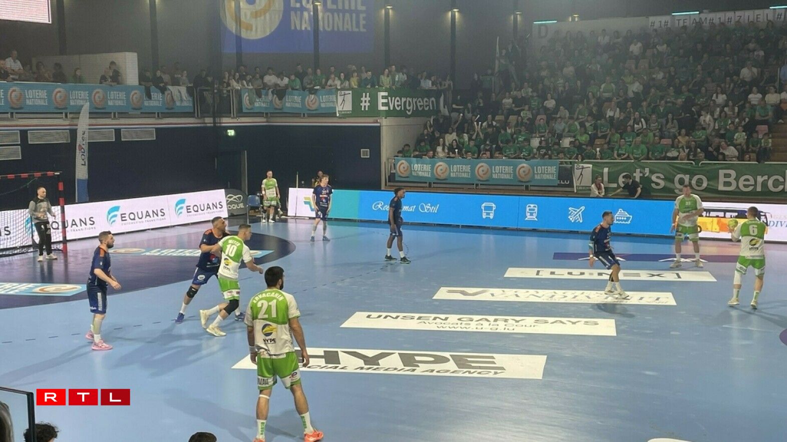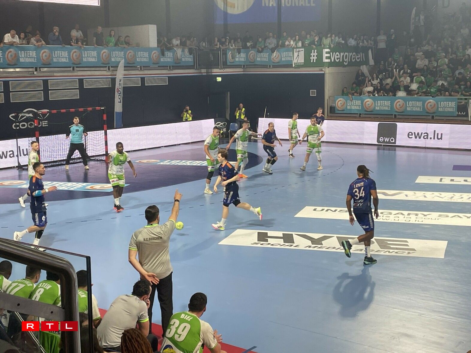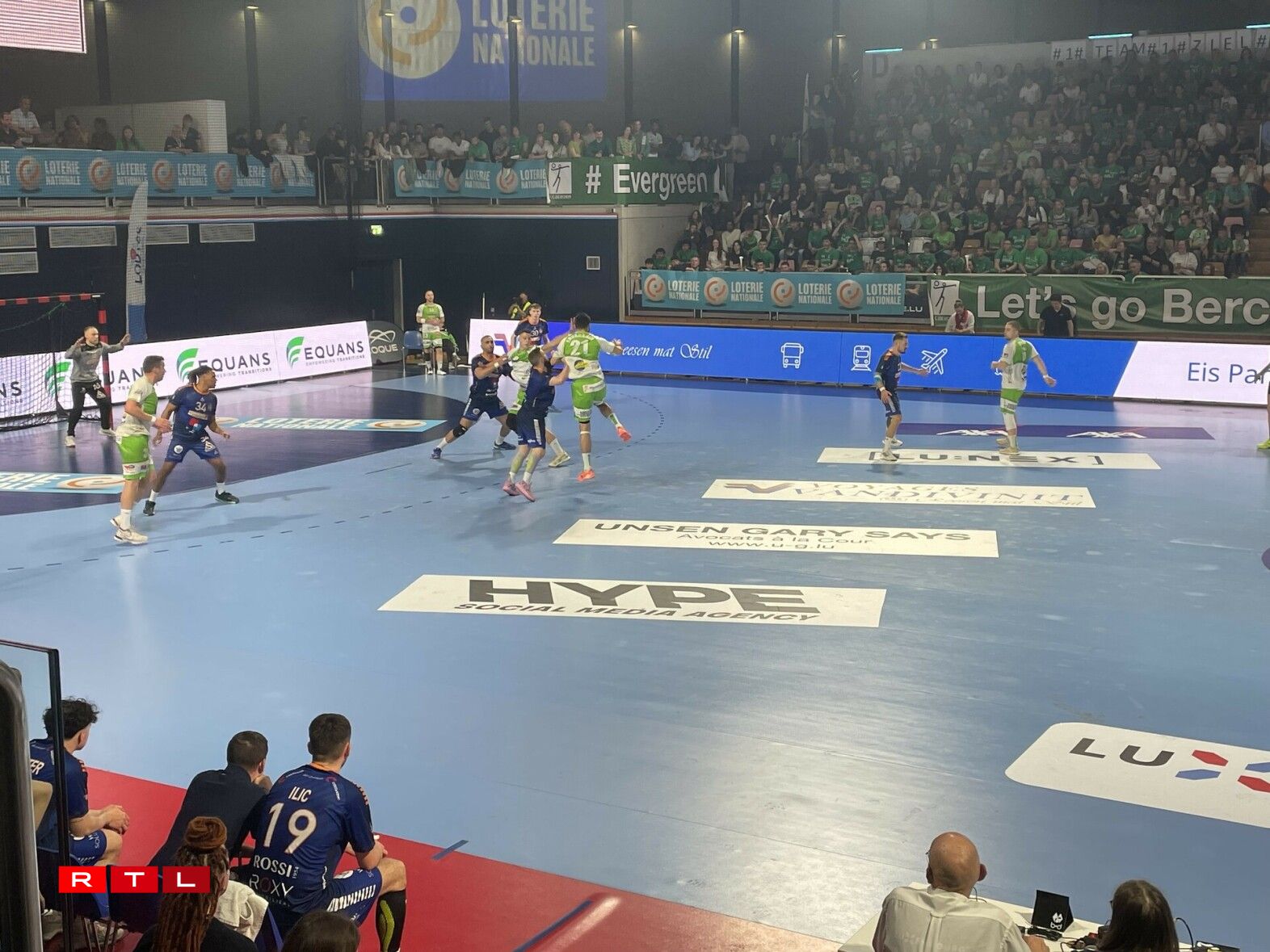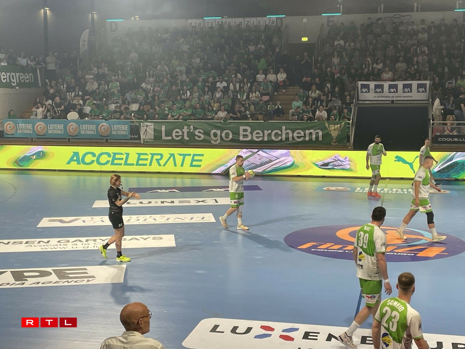 De Rusty, d’Diddelenger Maskottchen, huet nieft dem Terrain alles ginn, fir d’Supporter ze animéieren, an d’Ënnerstëtzung war och do, och wann d’Gesiichter ëmmer méi laang goufen. De Support vun den Tribünen ass awer net op d’Spiller iwwergaangen. D’Säite goufe beim Stand vun 18:8 fir Bierchem gewiesselt.