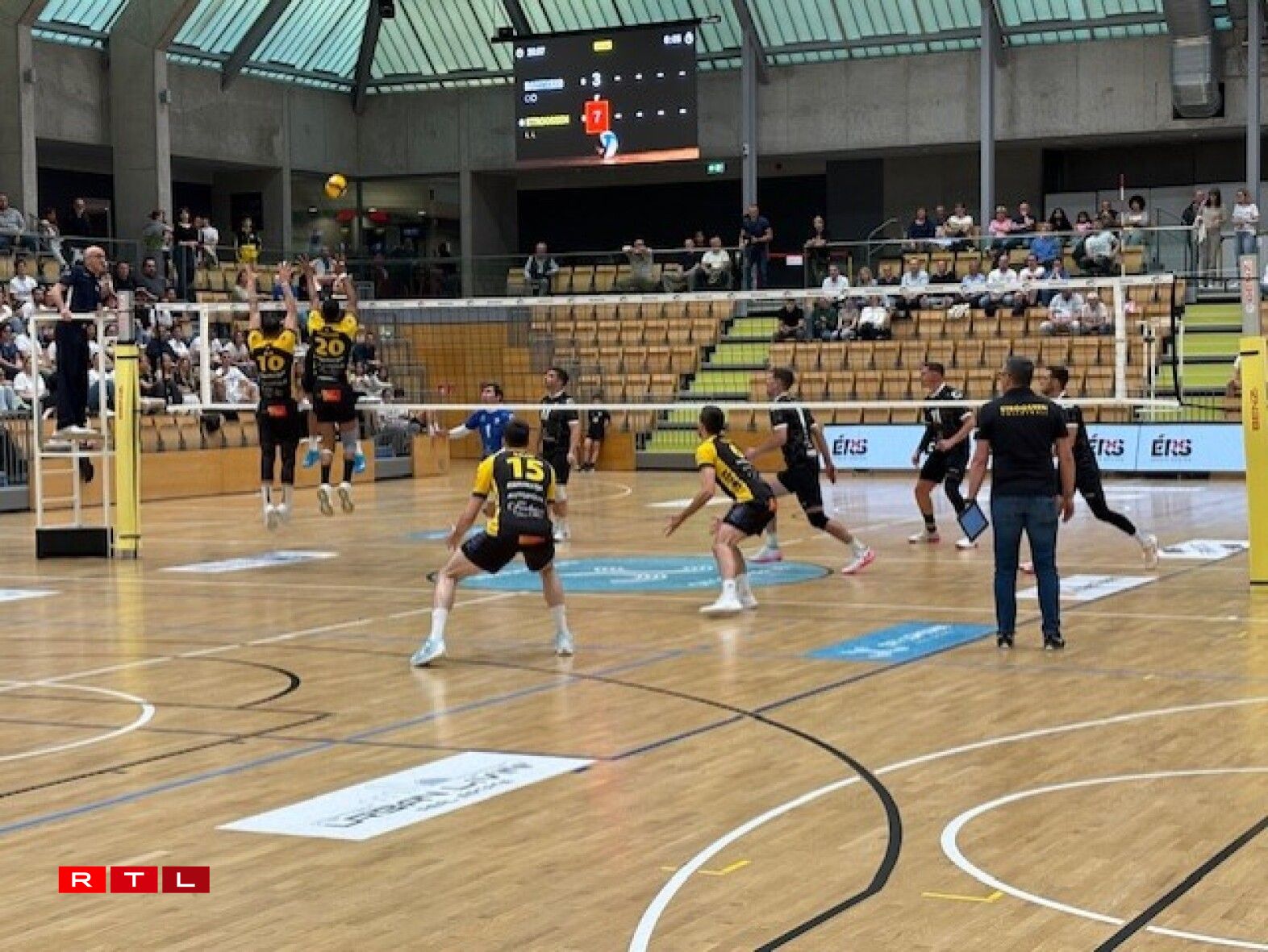 Mat Momenter gouf sech méi mat den Decisioune vum Arbitrage beschäftegt ewéi mam Match, wat der Konzentratioun net gehollef huet. Bartreng ass awer weider volle Risiko gaangen an huet iwwert de Kampfgeescht nees an de Match fonnt. Bei 18-20 huet de Stroossener Coach misse säin éischten Timeout asetzen. Dësen hat Wierkung a Stroossen setzt den Ecart ëm 3 Punkten op 23-18 erop. Mat engem weideren direkte Feeler vu Bartreng um Service geet den éischte Saz un den Titelverdeedeger.
