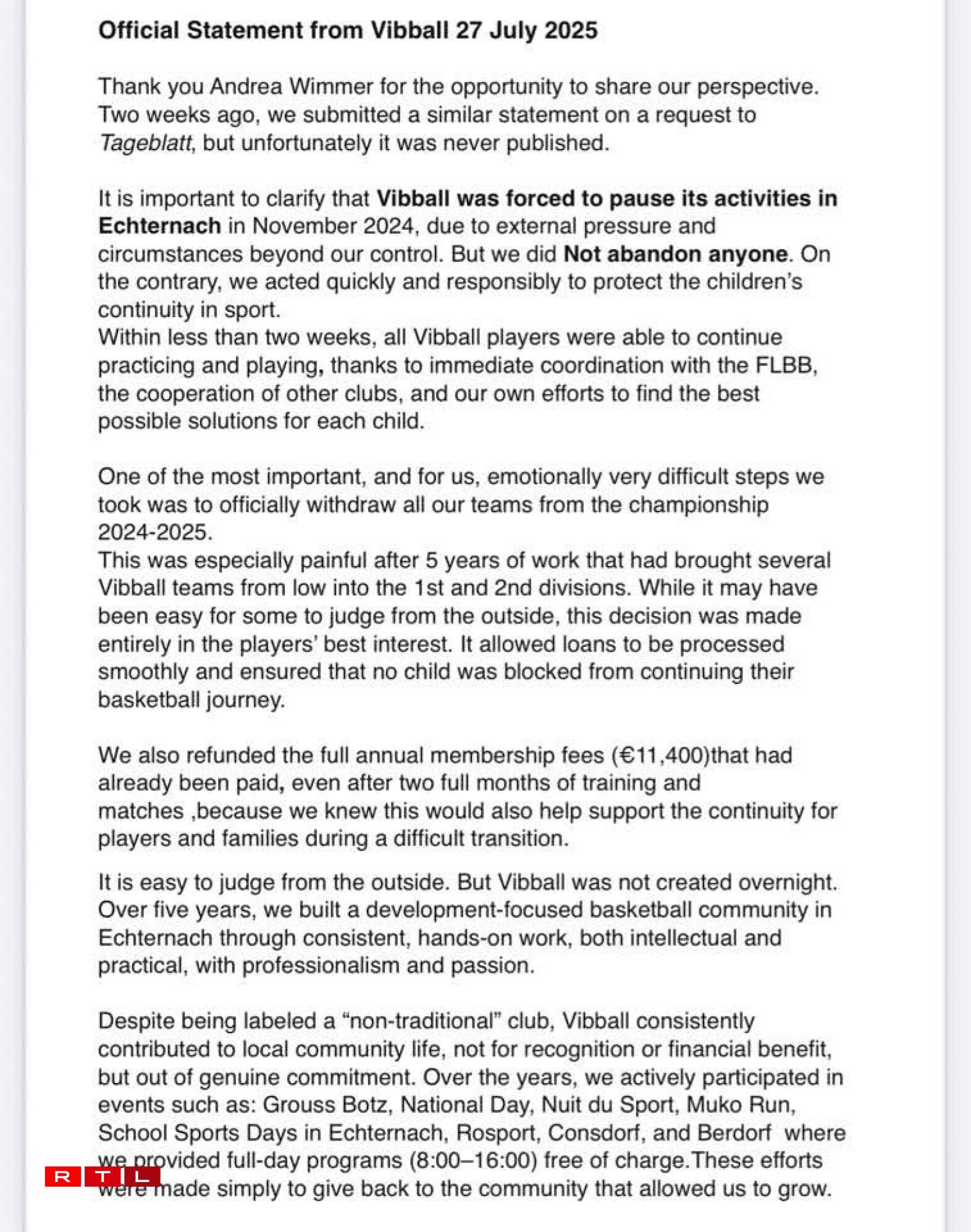 De Vibball Iechternach hat sech de 27. Juli an engem offizielle Statement zu Wuert gemellt:
