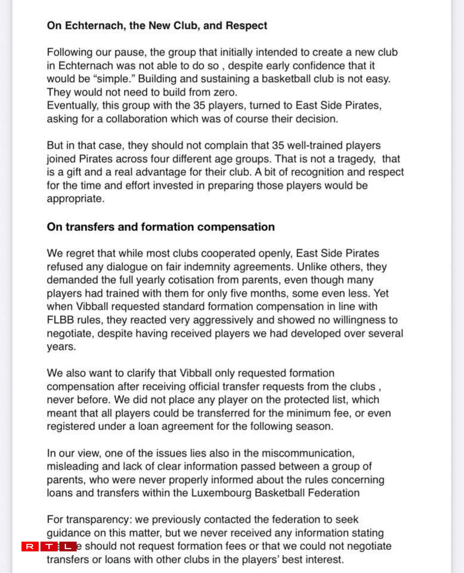 Fir d’Tribunal vun der FLBB huet den Alphonse Berns geschwat; fir hie schéngt et kloer hei ëm Geld ze goen, wat d’Trainerin a Cheffin vum Vibball, Yldikò Vass, awer kategoresch zeréckweist. Si géingen d’Kanner ëmmer nach zu Iechternach trainéieren, allerdéngs an der Jugendherberg, mee u sech wiere si elo an der Hal vun der International School doheem. A si géifen och weider Iechternacher Kanner trainéieren a Championnat spille loossen. D’Eltere soe sech net informéiert iwwer de Stopp vum Training, d’Kanner hätte virun der zougespaarter Hal gestanen a wieren elo forcéiert, de Club ze wiesselen.